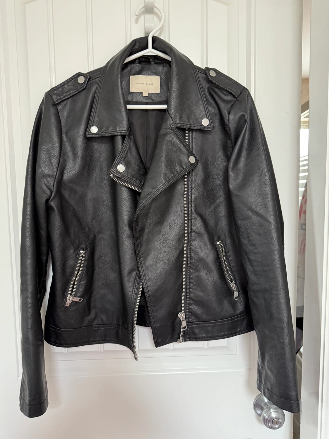 Selling a stylish black faux leather jacket from Monk & Lou in a size large. It's in great condition and ready for a new home! Perfect for adding a bit of edge to any outfit