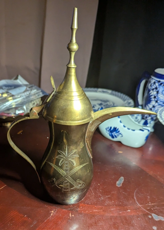 Selling a vintage brass Dallah coffee pot, originating from Saudi Arabia. It has a beautiful, aged patina and intricate detailing, including a palm tree and crossed swords design. A unique piece for collectors or anyone who appreciates cultural artifacts! 532ml capacity if you want me to deliver it to the other end of the city then double price and McDonald's meal (not even joking)