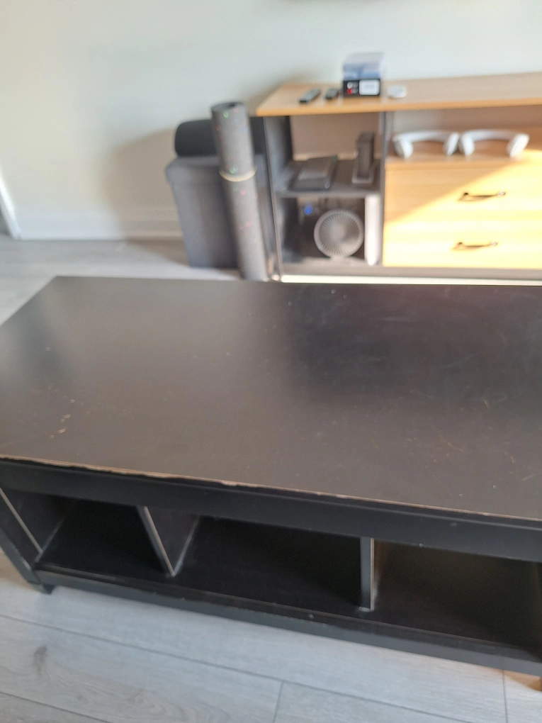 Selling a black coffee table. It has some signs of wear on the top surface. Features convenient storage shelves underneath