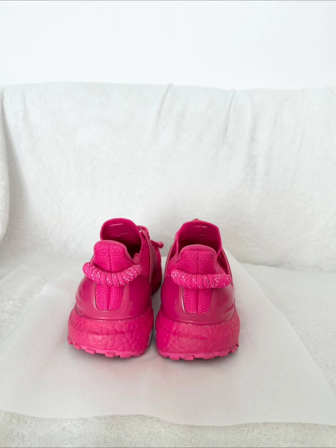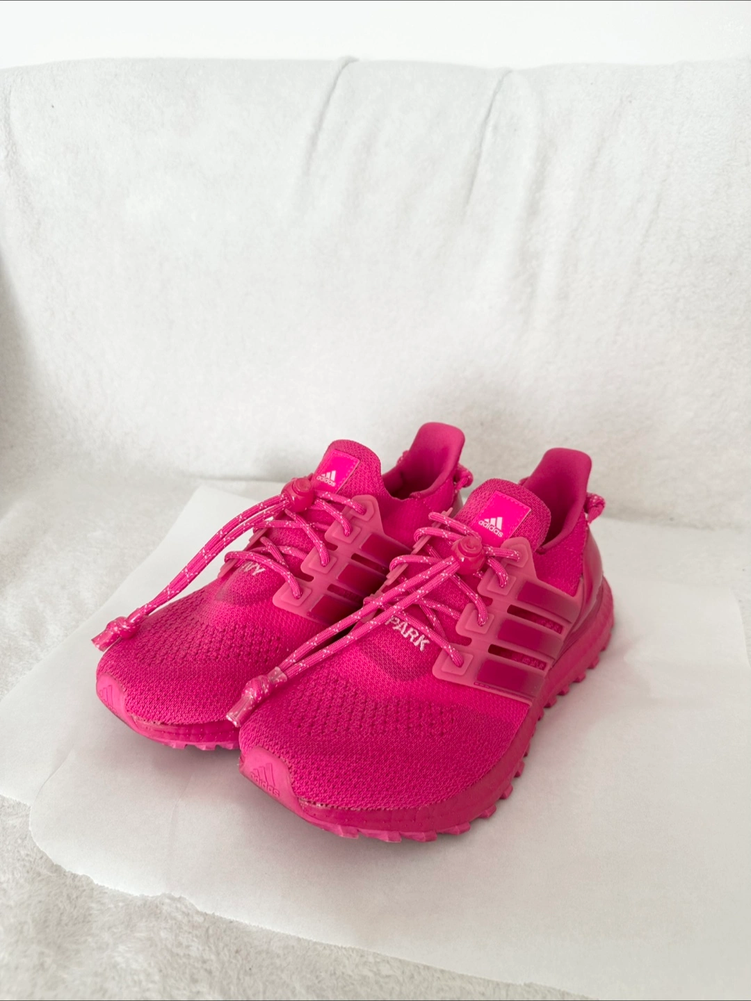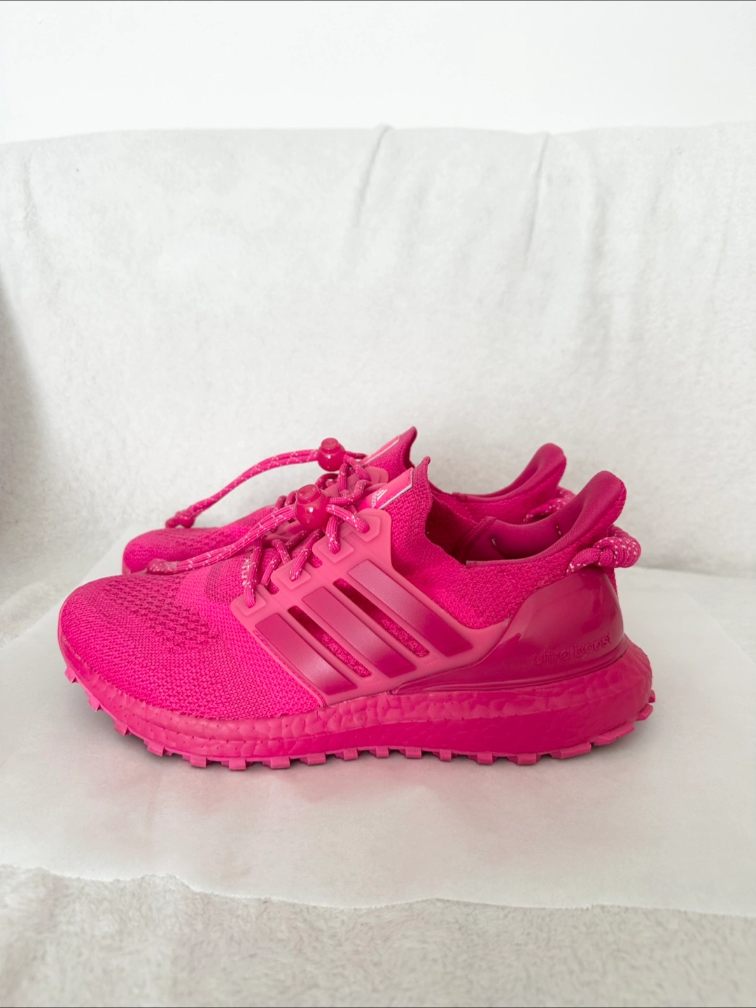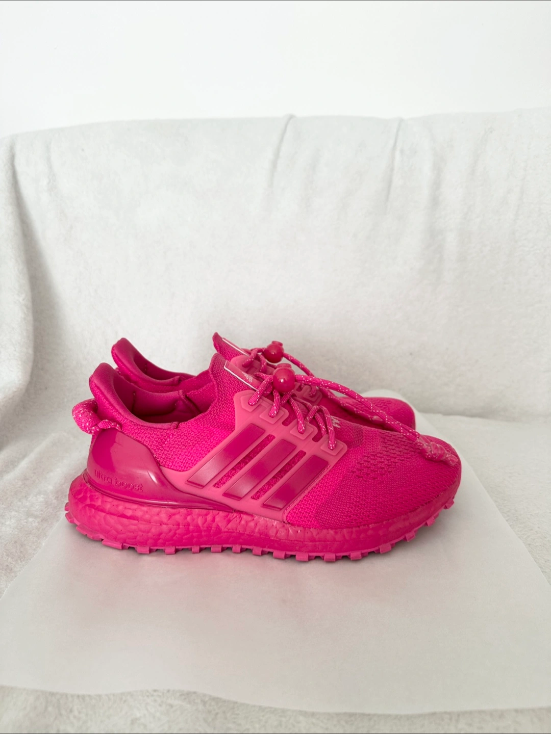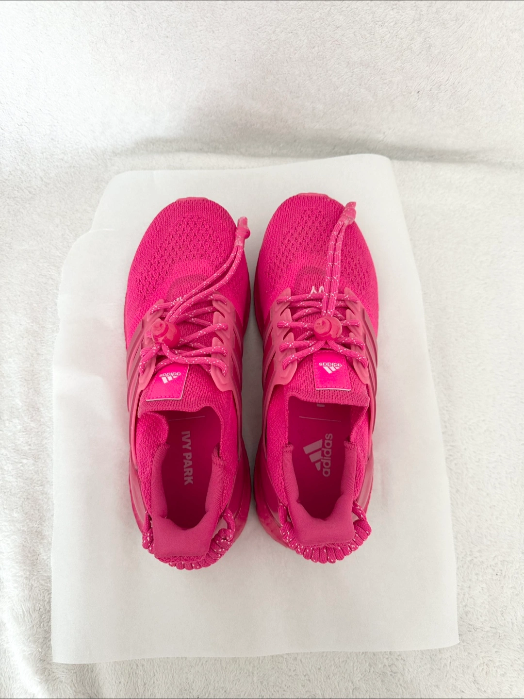 Selling a pair of Adidas x Ivy Park Ultra Boost sneakers in a vibrant pink colour! This series is a limited release and not available in stores anymore. Purchased from the Adidas Official Website. Worn twice only. Including the branded shoe bag and tag accessory (see picture #6). No shoe box. Condition: Almost Like New Colorway: Shock Pink/Real Magenta/True Pink Nick name: Ivy Heart Size: 38(FR) / 5.5 (Men’s US) Can be picked up near the Eaton Centre. Cash only and no return or refund. Other details: The Ivy Park x adidas UltraBoost OG ‘Ivy Heart’ delivers Beyoncé’s elevated take on the lifestyle running shoe. Dressed in a monochrome fuchsia color scheme, the sneaker features a textile knit upper with a toggle lacing system integrated into the midfoot cage. Leather tongue tags display standard adidas branding, while ‘Ivy Park’ is embroidered across the vamp of the right and left shoe. A coiled pull loop at the heel provides easy on and off. The lightweight build rests on a color-matched Boost midsole, supported by a Stretchweb Continental Rubber outsole.