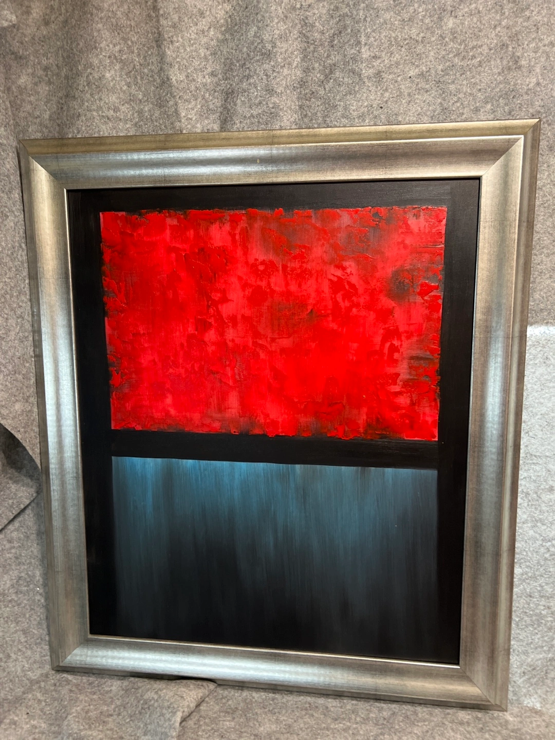 This is a framed painting with an abstract design. The upper portion features a vibrant red texture, while the lower part is a sleek black. The frame is a stylish silver colour. It would be a great addition to any room!