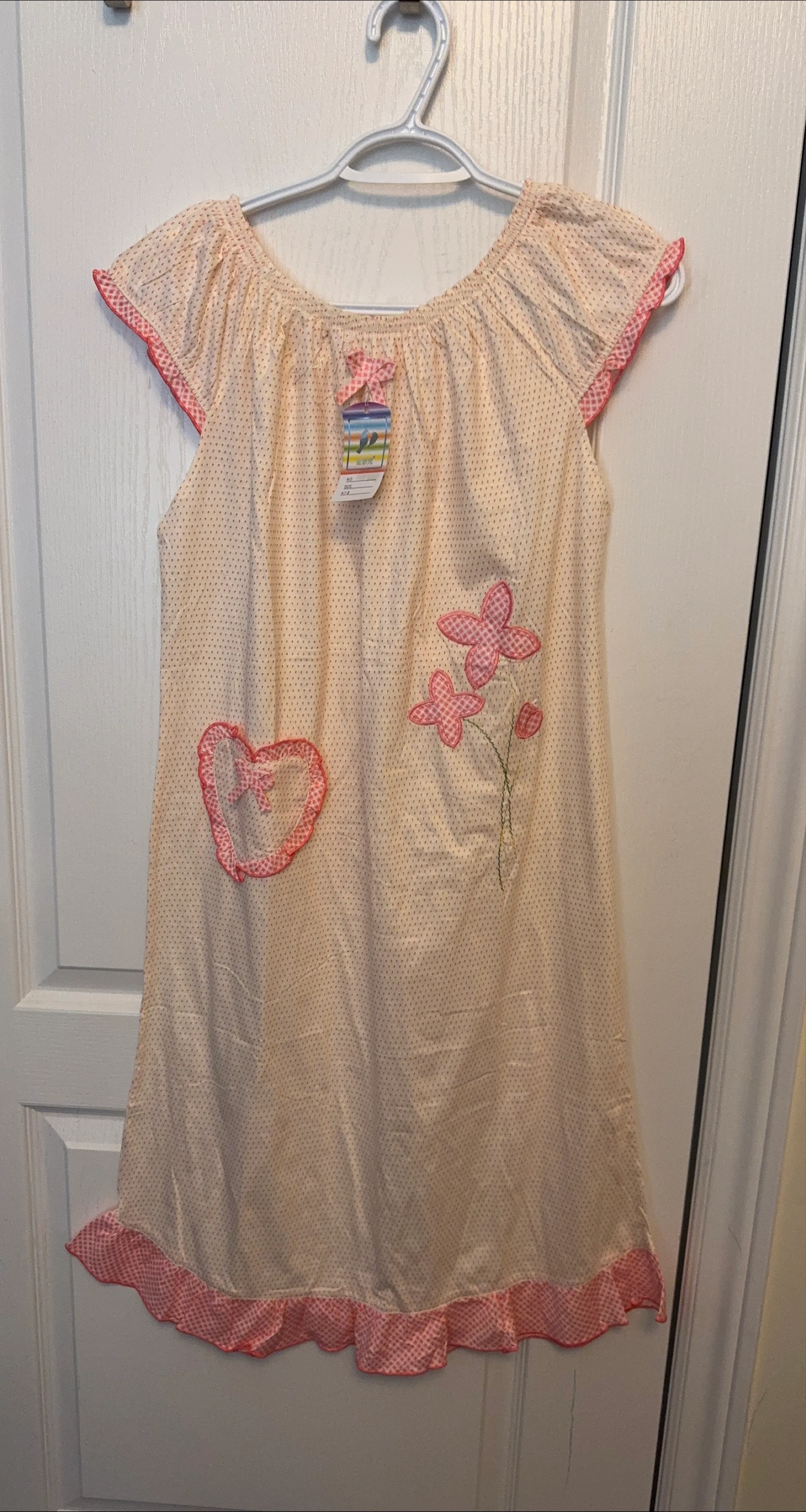 Adorable dress is cream-coloured with cute pink accents! No stains or any markings, smoke free household. 65% cotton and 35% polyester. No size but seems like a S or M