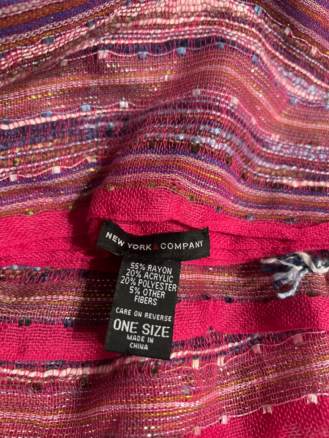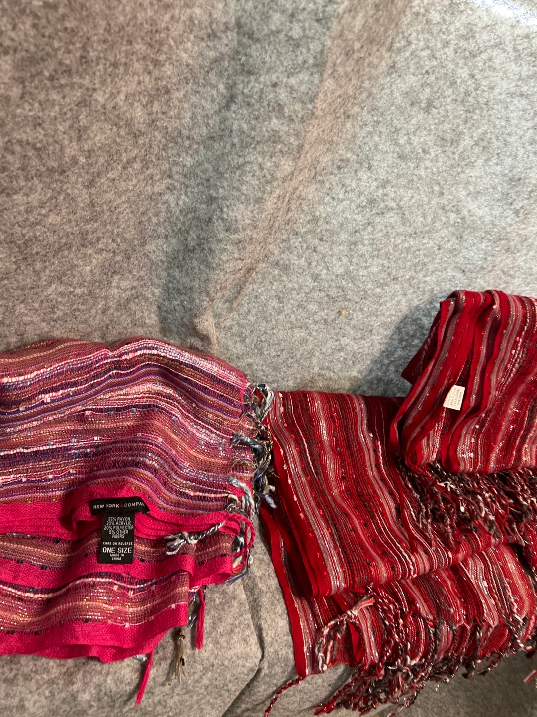 Two scarves for sale! One is from New York & Company and is one size. It's made of 55% rayon, 20% acrylic, 20% polyester, and 5% other fibers. The other scarf is made of 95% polyester and 5% lurex.