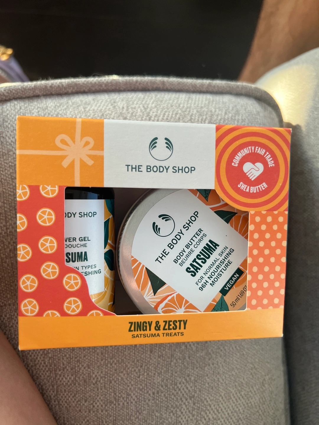 Brand new Satsuma Treats gift set from The Body Shop! This zingy and zesty set includes a Satsuma Shower Gel (60 ml) and a Satsuma Body Butter (50 ml) for normal skin. Perfect for 96 hours of nourishing moisture!