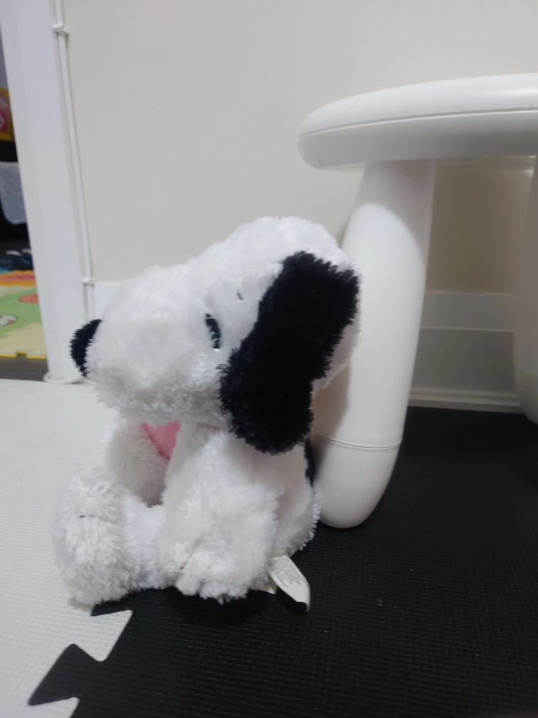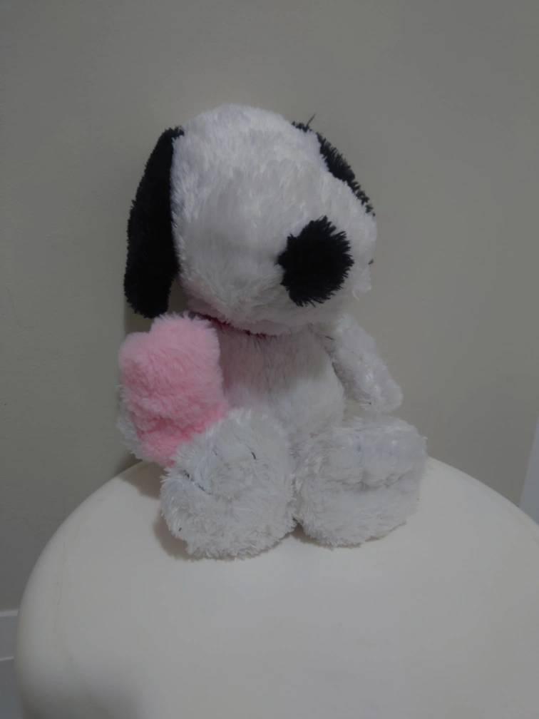 A cuddly Snoopy plush toy looking for a new home! This adorable plushie features Snoopy holding a pink heart. It's in great condition and ready to be loved by a new owner