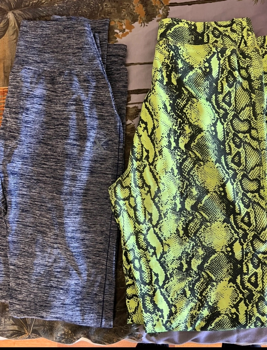 Two pairs of leggings for sale! One is a blue heathered colour, and the other is a fun neon yellow snake print. Both are in great condition and ready for a new home