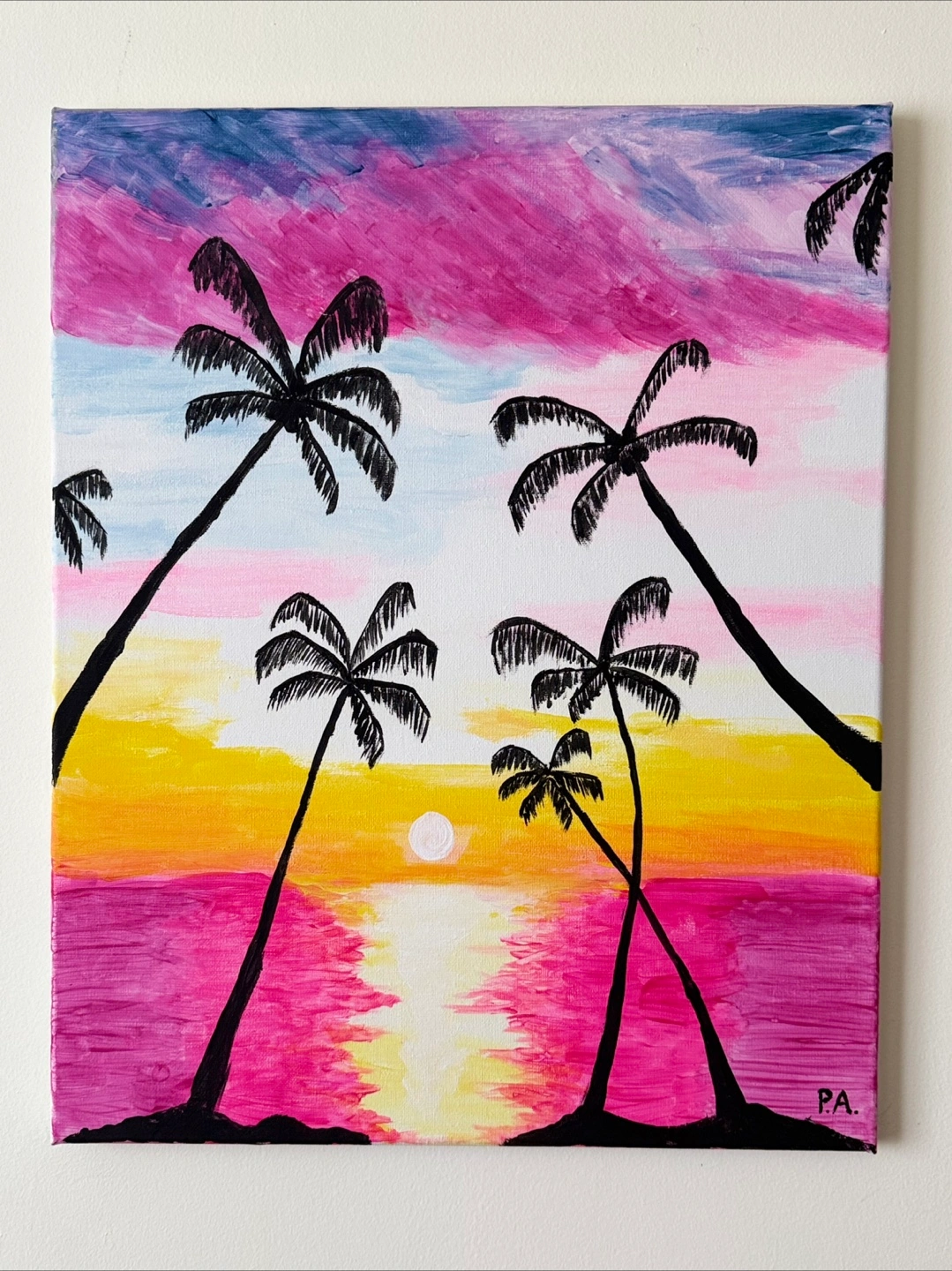 Original hand-painted canvas artwork featuring a serene tropical sunset with palm trees. Stunning blend of pink, purple, yellow, and orange tones that add a vibrant yet calming vibe to any space. Perfect for wall decor in bedrooms, living rooms, or workspaces. Signed by artist (P.A).