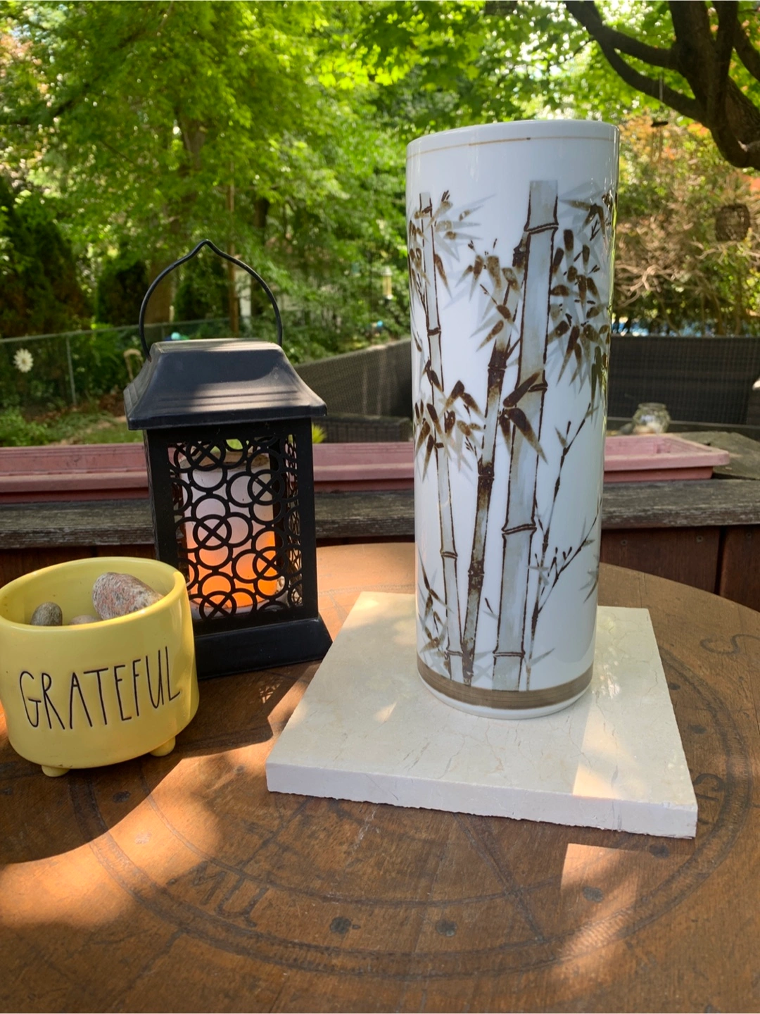 Lovely vintage Japanese collectable vase with a glazed bamboo design in white and brown. Features a beautiful arrangement of bamboo, most likely hand painted with a thick brown stripe around the base and a thin stripe along the top. It is in very good vintage condition with just two tiny flea bites on the inside of the rim which arenβt really noticeable unless you are looking for them. Artist signature at the bottom plus is stamped JAPAN. Perfect for adding a touch of zen or Asian design to your home decor! An awesome rare piece!