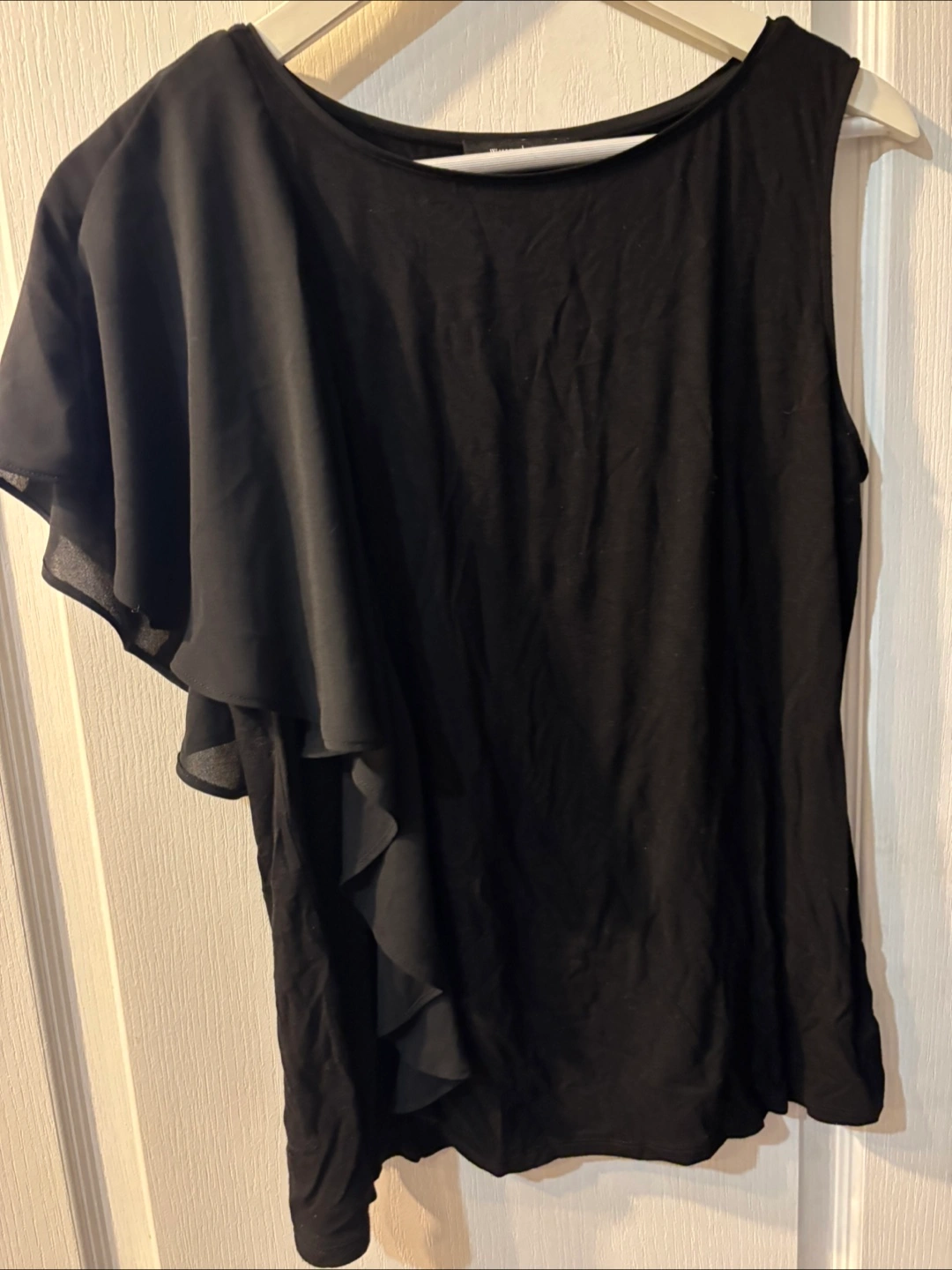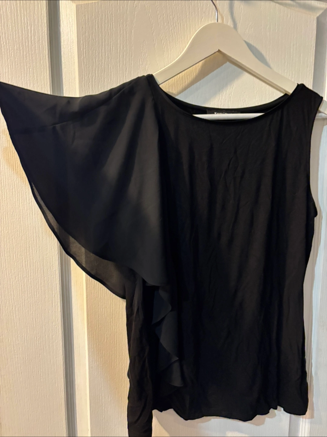 Here's a stylish black top from White House Black Market! It's a size medium and features a unique asymmetrical design with a fluttery detail on one side. Perfect for dressing up or down!