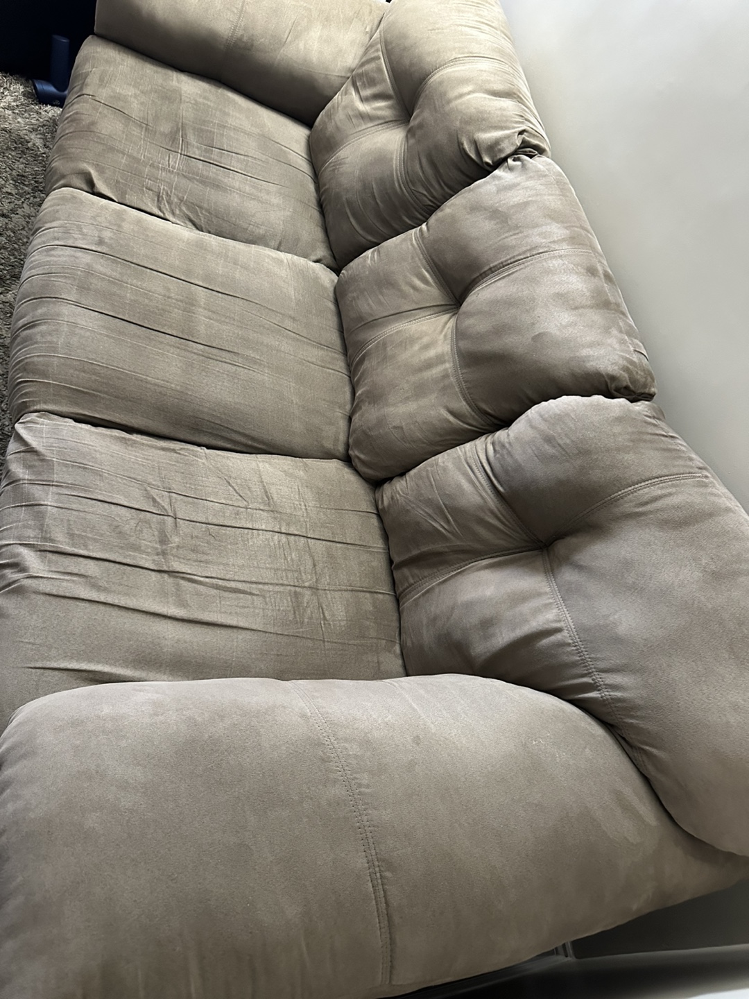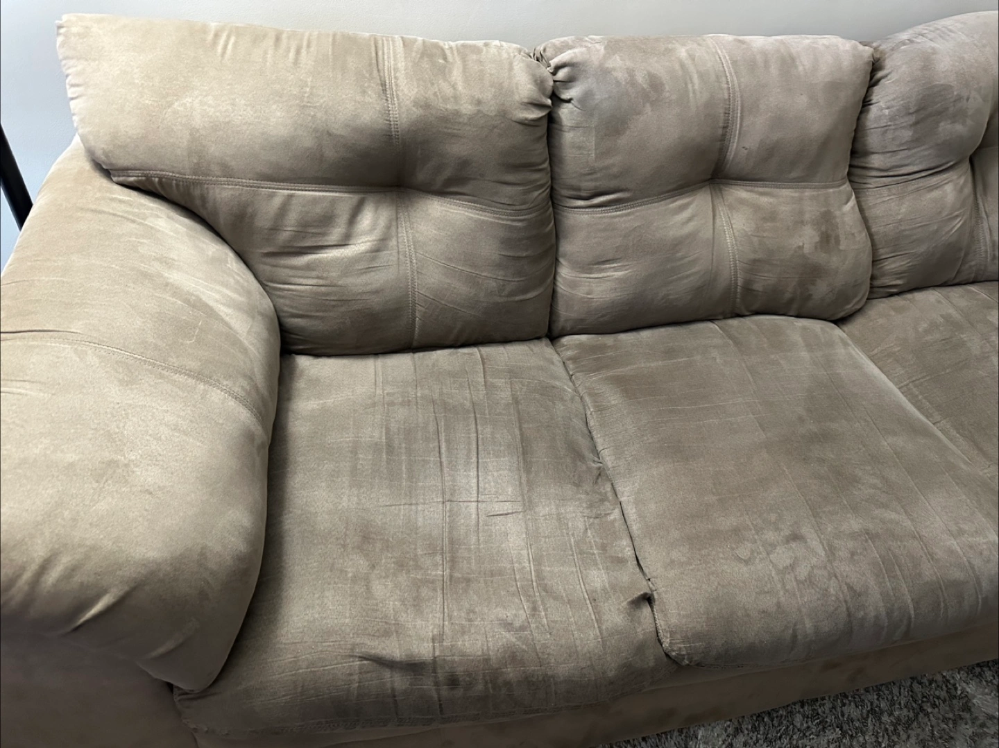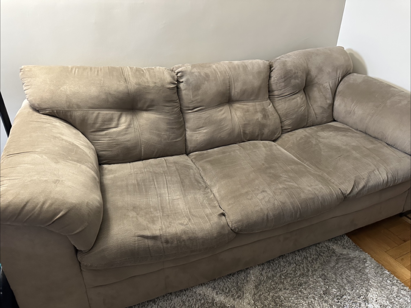 Size 88x36x36in, tan color, microfiber material. Well loved and has a wooden part in the back that cracked but screwed back in, not noticeable and does not affect function of couch. Available for pick up, can help place in vehicle.