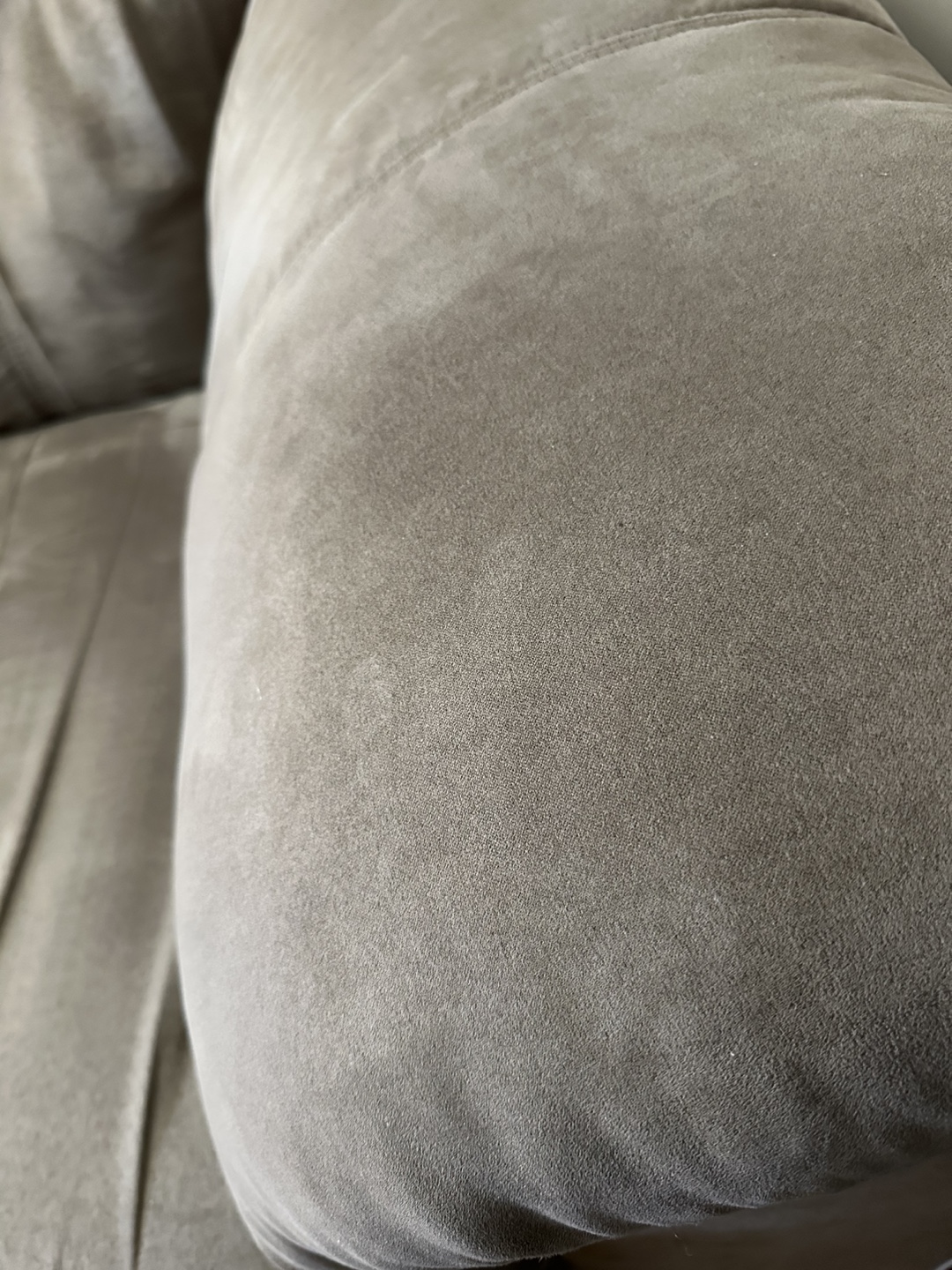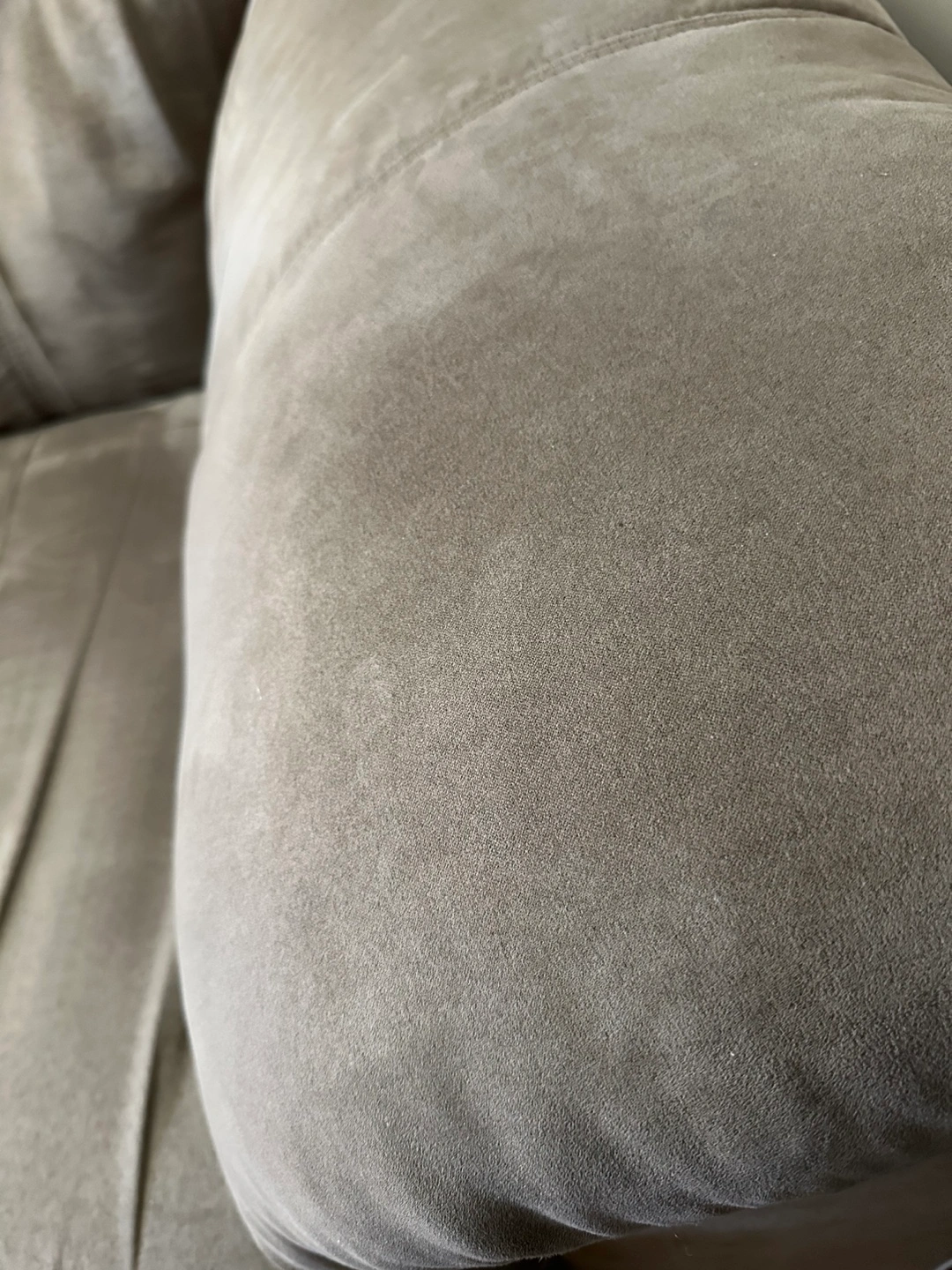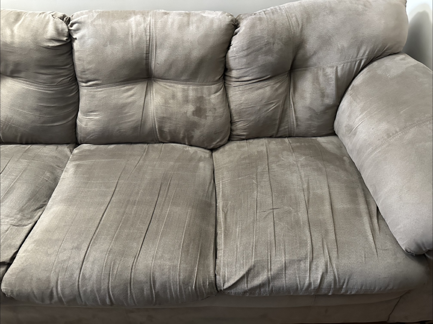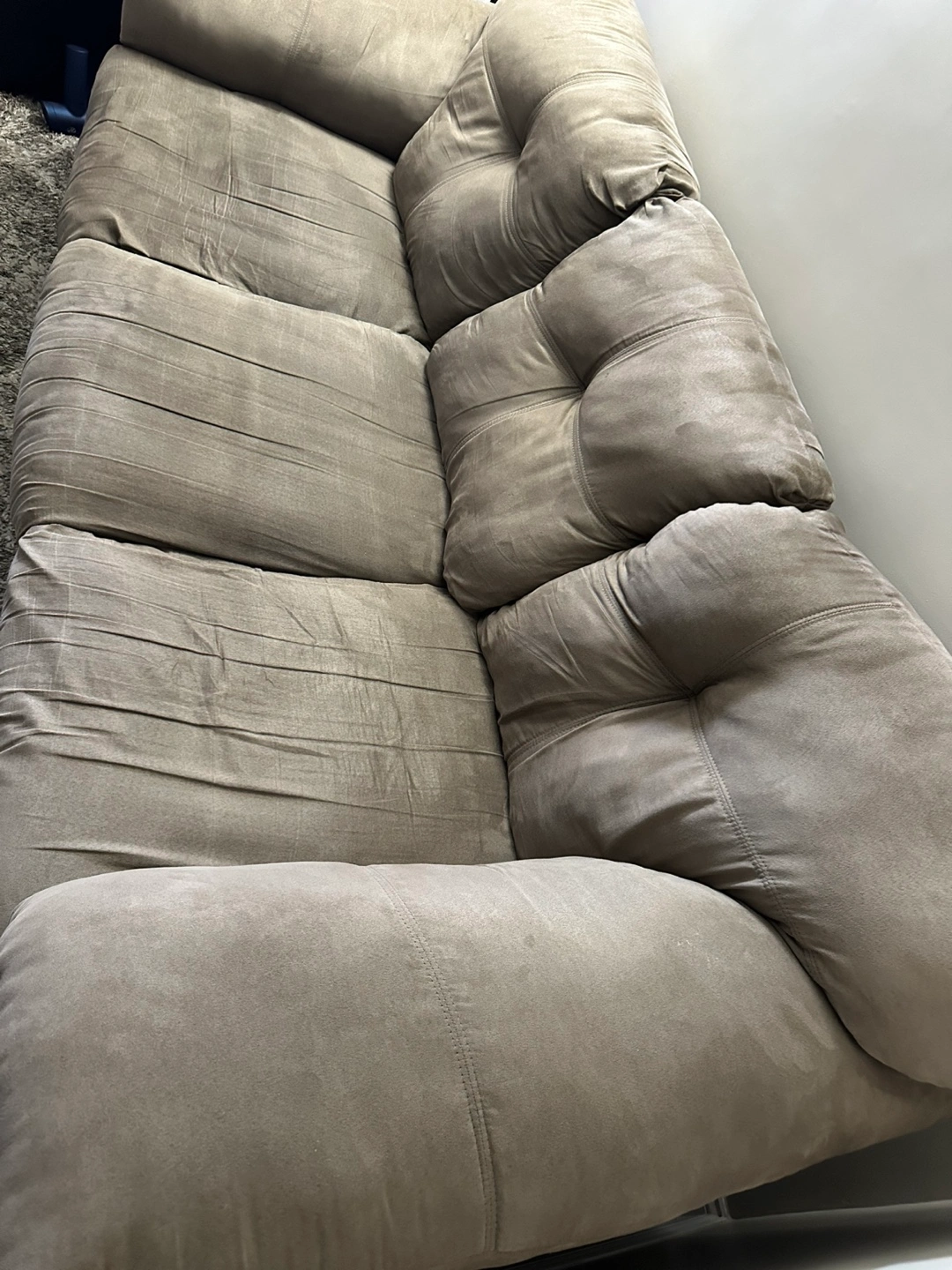Size 88x36x36in, tan color, microfiber material. Well loved and has a wooden part in the back that cracked but screwed back in, not noticeable and does not affect function of couch. Available for pick up, can help place in vehicle.