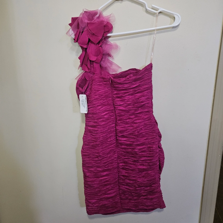 Selling a Romeo & Juliet Couture dress in a vibrant fuchsia colour! It's a size small and features a unique one-shoulder design with floral detailing. Perfect for a night out or special occasion!