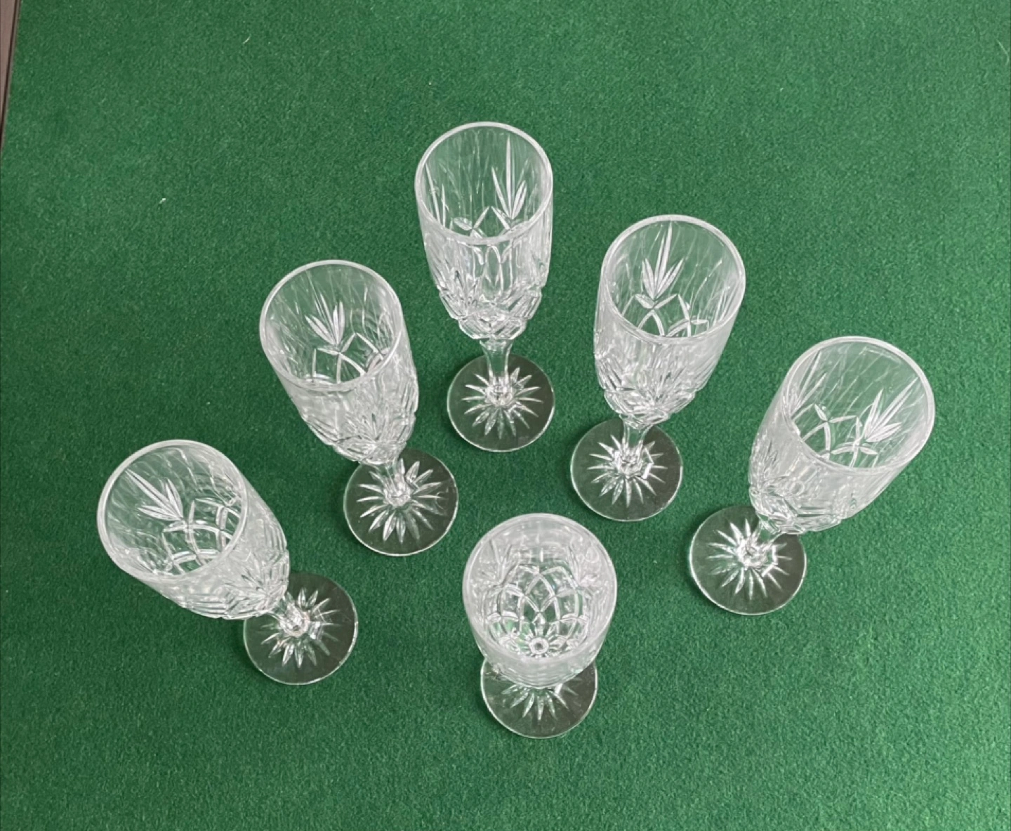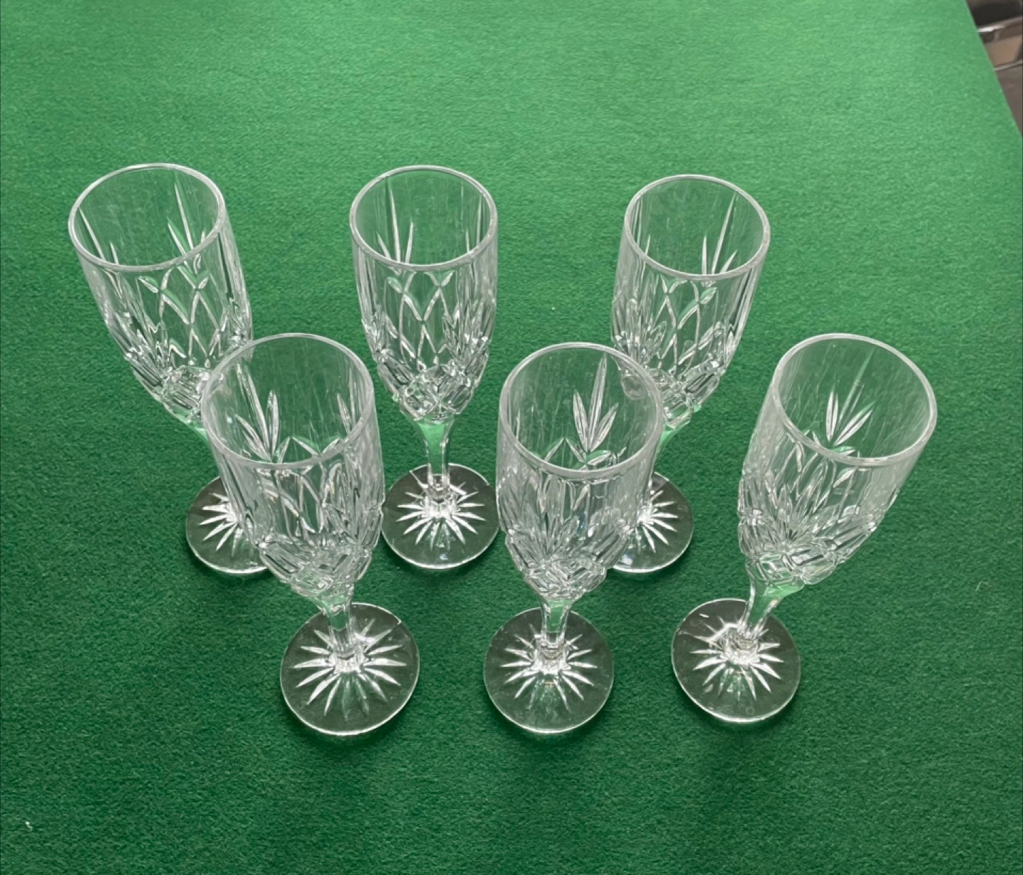 Elevate your dining experience with this set of six elegant champagne flutes. These glasses feature a beautiful cut design, adding a touch of sophistication to any occasion. The flutes are in good condition and ready to sparkle at your next celebration.