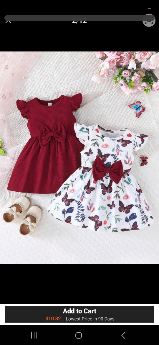 Two adorable baby girl dresses, perfect for your little one! One is a solid burgundy color, and the other has a cute butterfly and floral print. Both dresses feature sweet bows. They're in great condition and ready for a new home! Size12 months