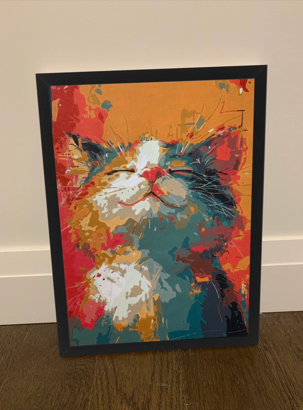 Here's a framed painting of a cute cat! It's a colourful piece that would look great in any room of the house