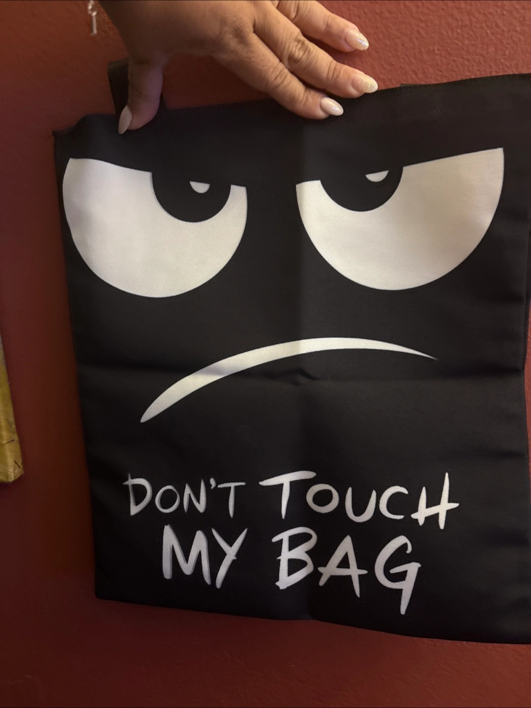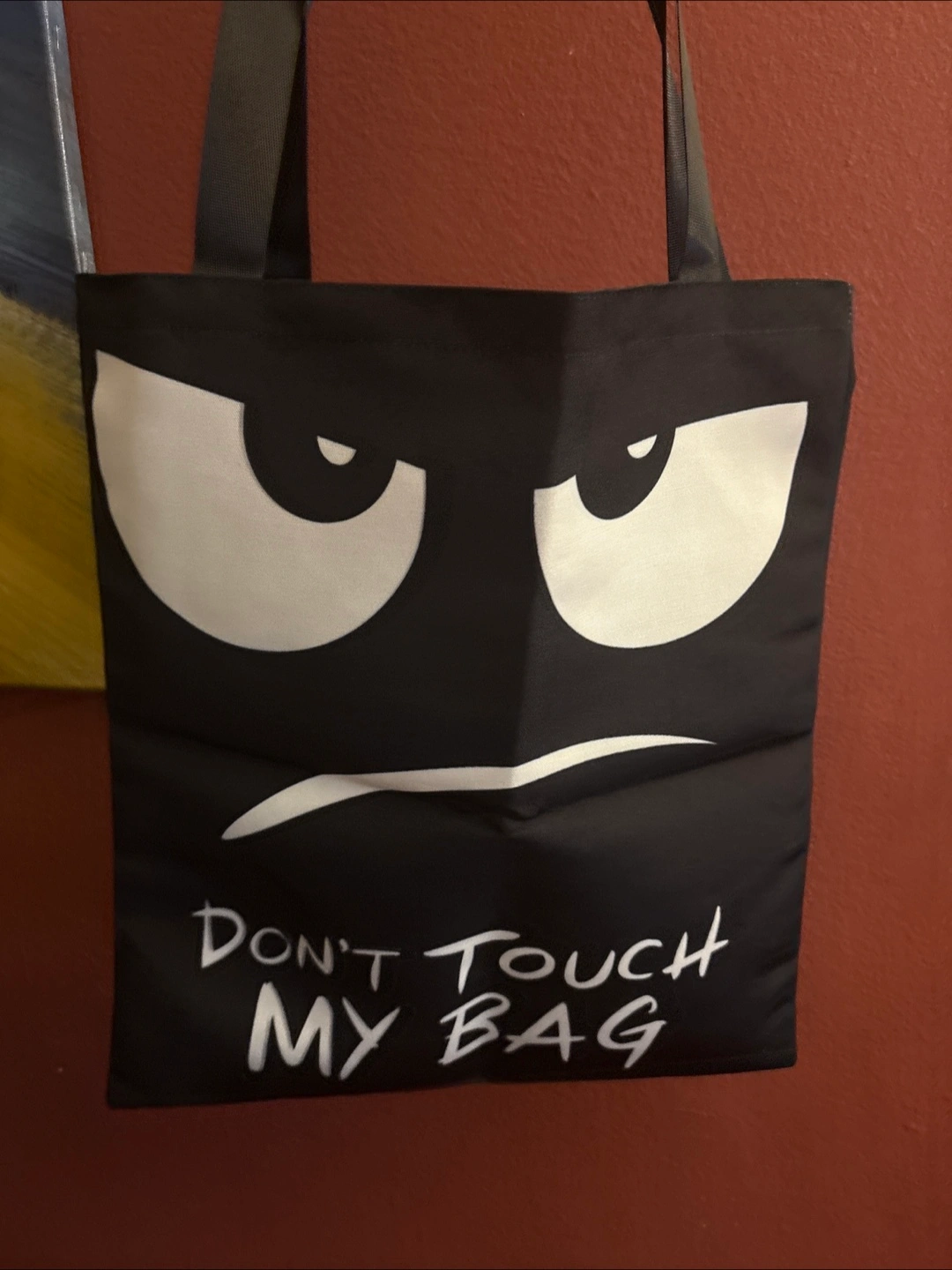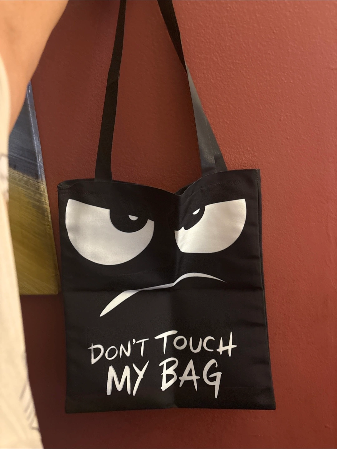 This is a black tote bag with a funny design! It has big white cartoon eyes and the text "DON'T TOUCH MY BAG" printed on it. perfect for carrying your essentials with a bit of humor New