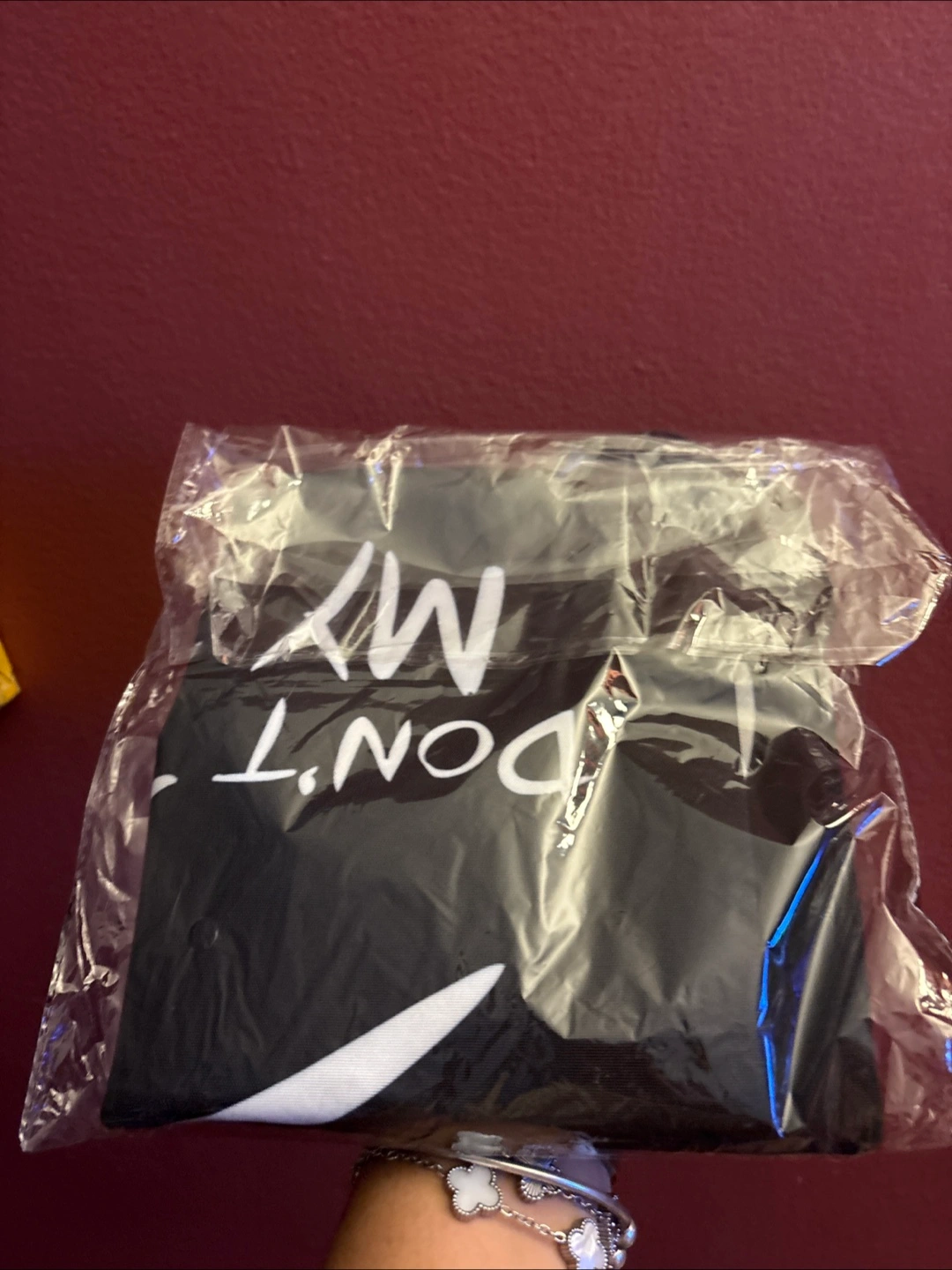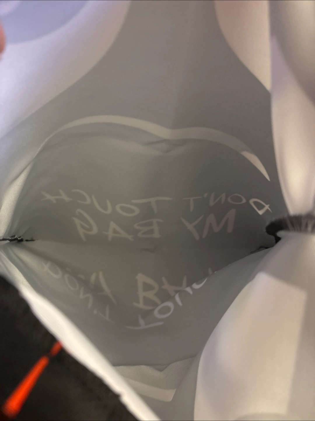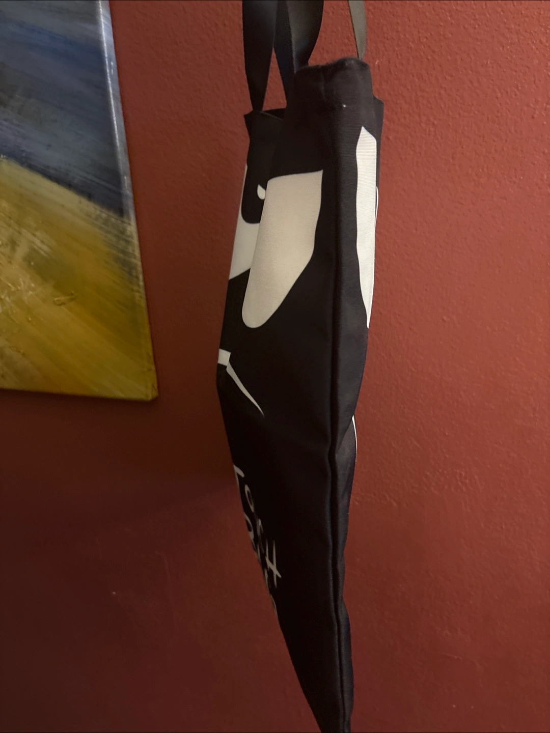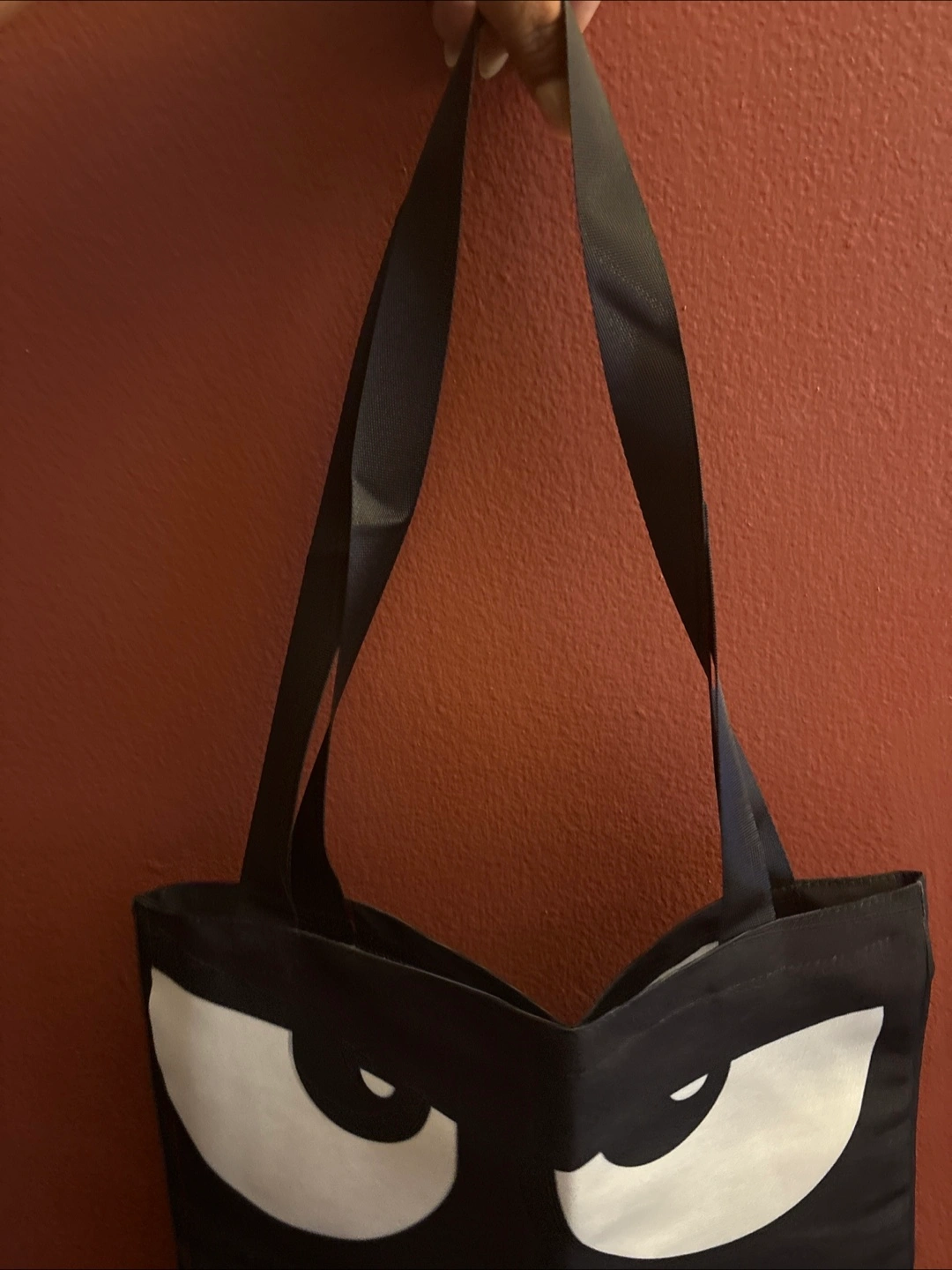 This is a black tote bag with a funny design! It has big white cartoon eyes and the text "DON'T TOUCH MY BAG" printed on it. perfect for carrying your essentials with a bit of humor New