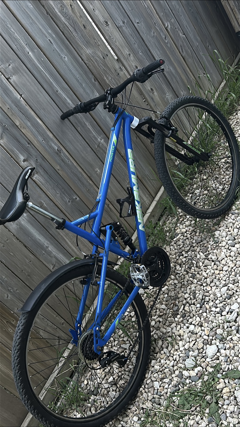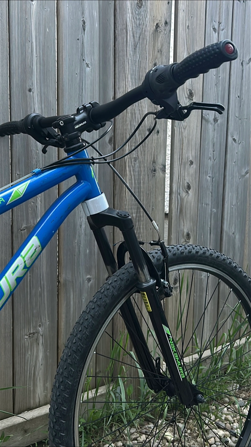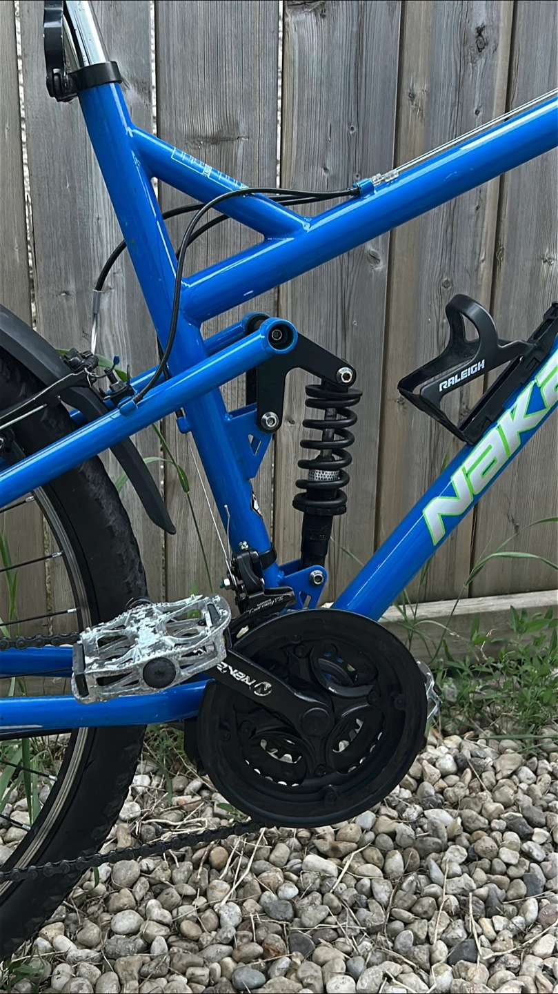 Selling a Nakamura Monster mountain bike in blue. It features a full suspension system for a smoother ride on trails. The bike has Shimano components and is ready for your next adventure!
