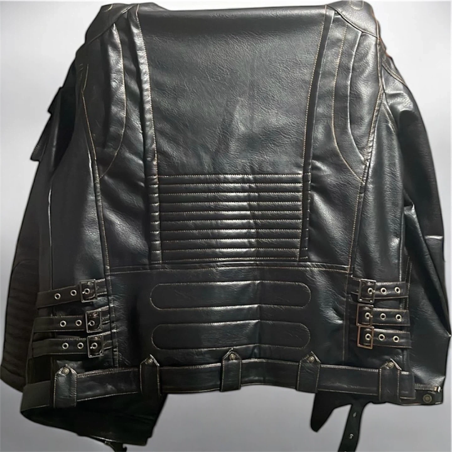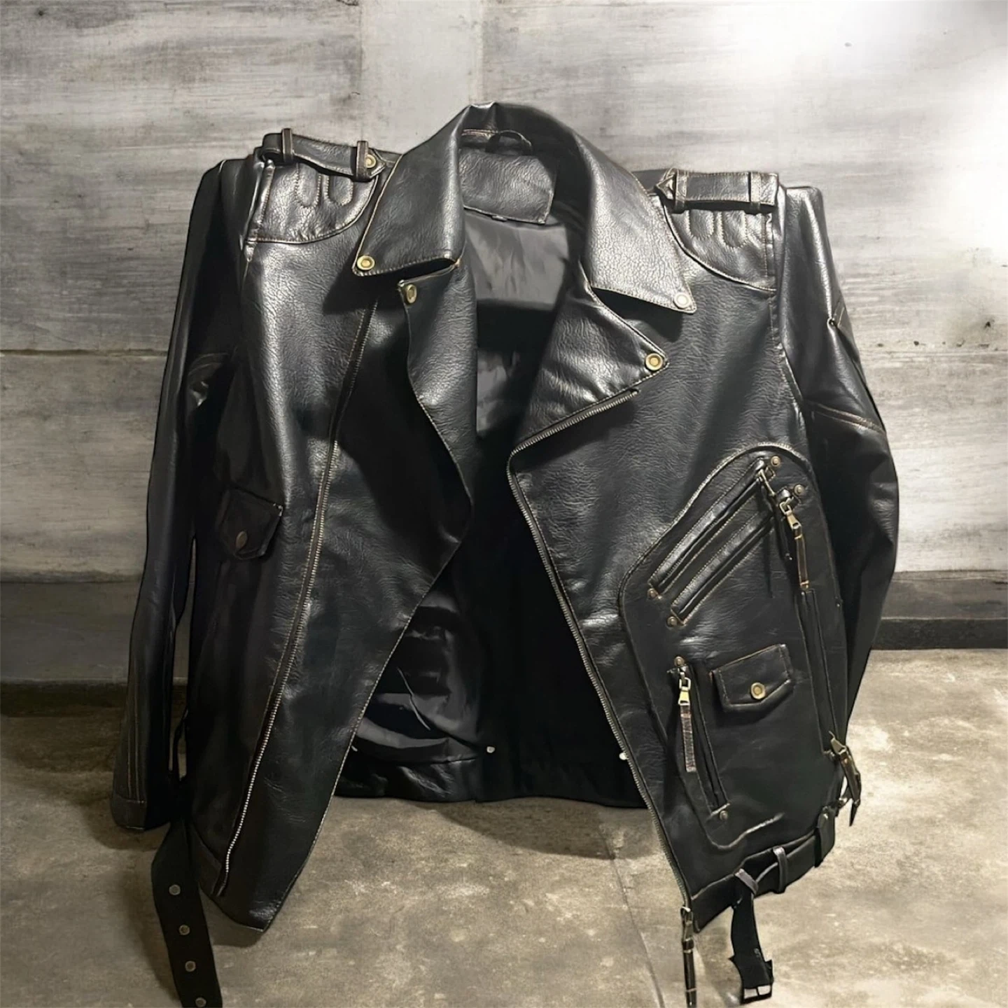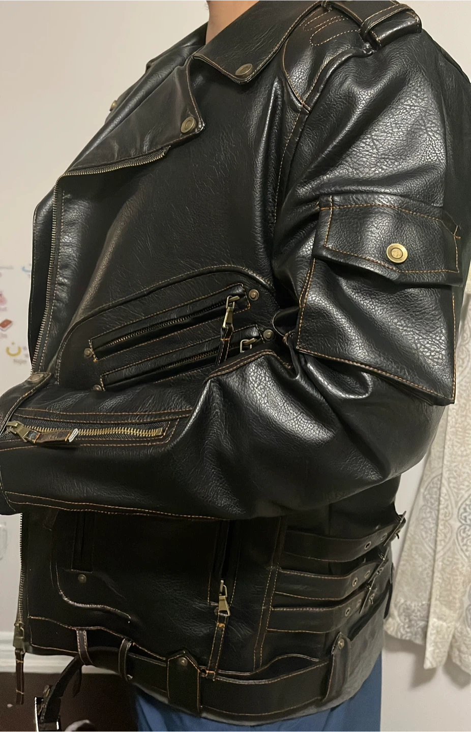 This bold and stylish men’s motorcycle-style jacket is brand new and never worn outdoors. Made with high-quality leather-look material, it features a classic biker design with modern details, giving it a premium and rugged appearance.