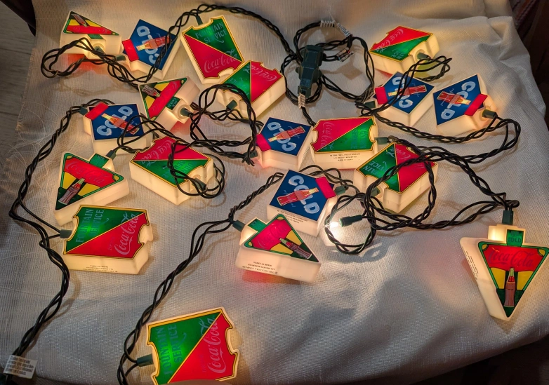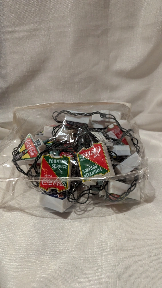 Coca-Cola string lights featuring various vintage Coca-Cola designs. They would be perfect for a retro-themed room or party! 2 working sets. Each set has 10 lights. Includes zippered bag to keep them all together.