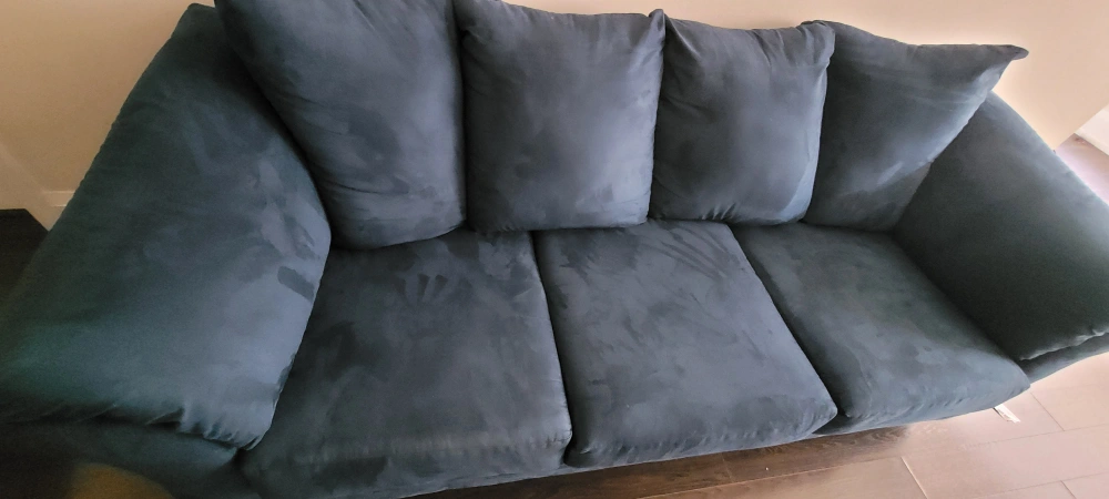 This sofa features a durable build and comfortable cushions, ideal for lounging and relaxing. The sofa shows minimal signs of wear, which is reflected in the price, but it remains a functional and attractive piece of furniture. It's ready for a new home!