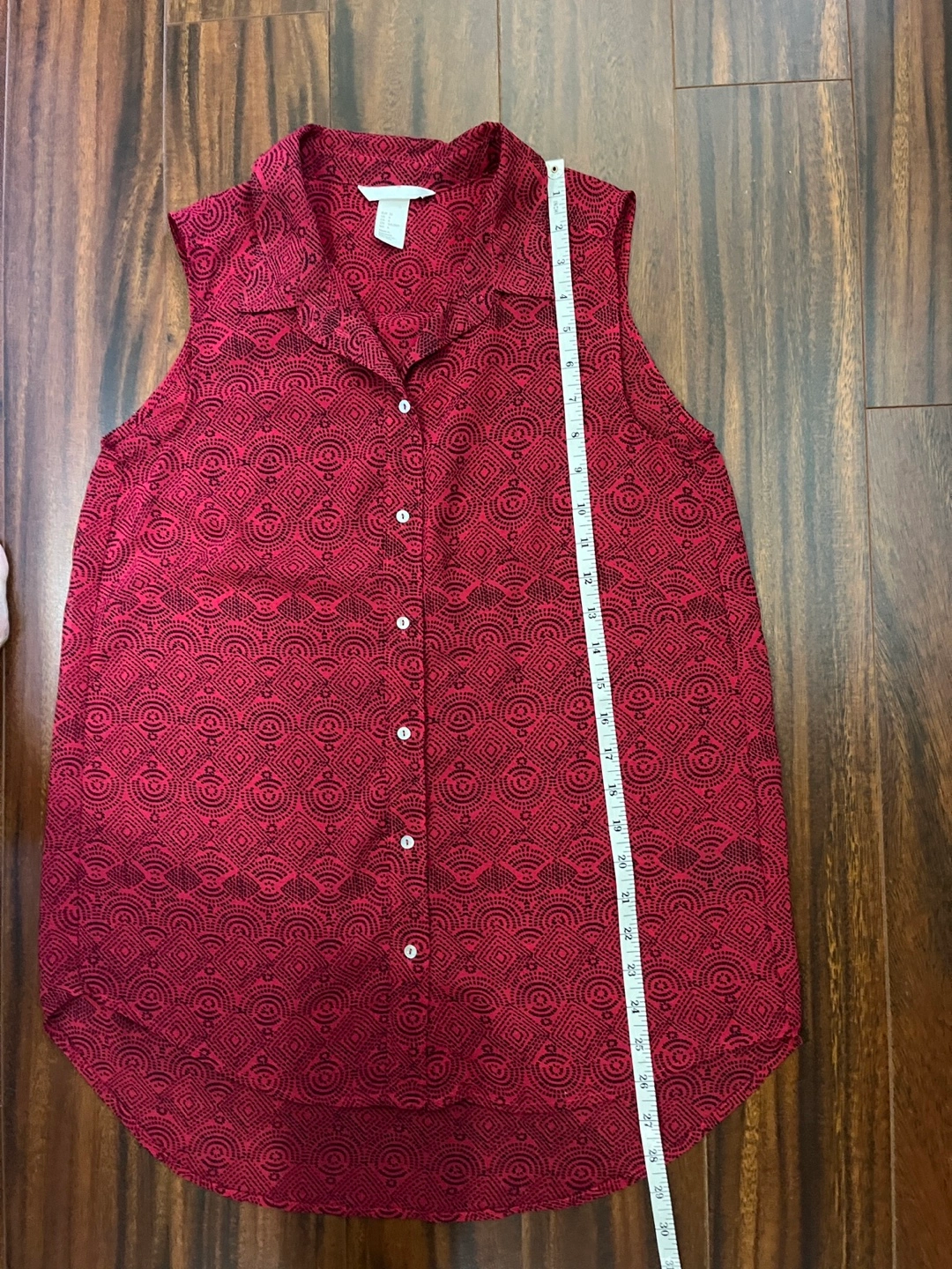 Eye-catching H&M sleeveless blouse, size 6, in raspberry with a black geometric print. Collared, button-up design with a semi-sheer finish, back pleat and curved hem that’s longer in the back. Lightweight and breathable.