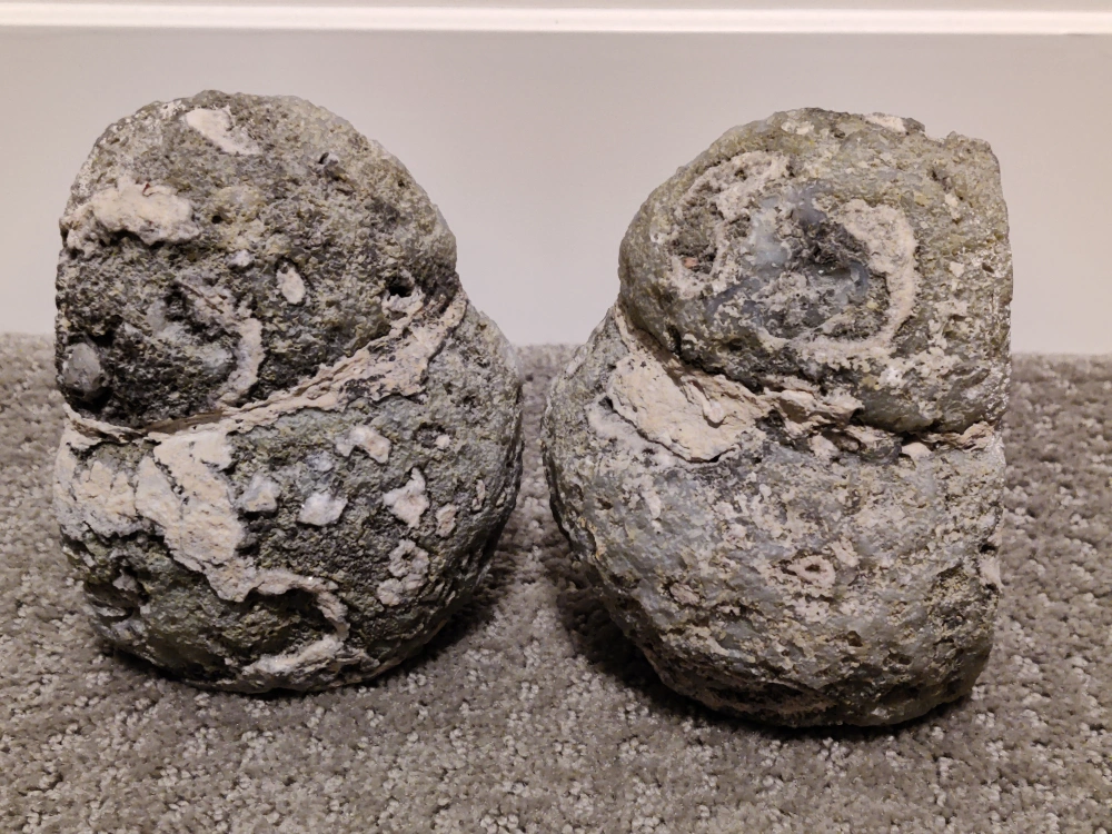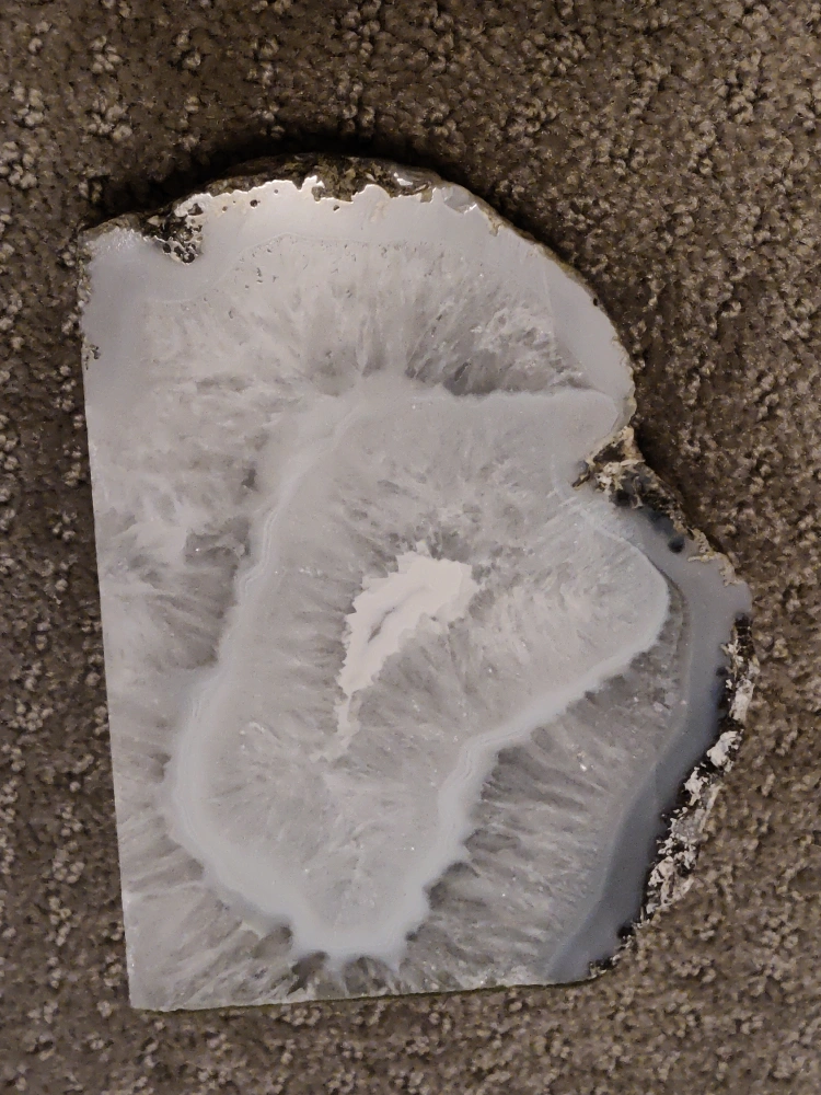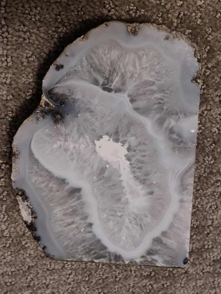 * Color: The polished faces feature a beautiful pattern of gray, white, and translucent crystal formations. The rough, unpolished exteriors showcase the natural texture of the stone.