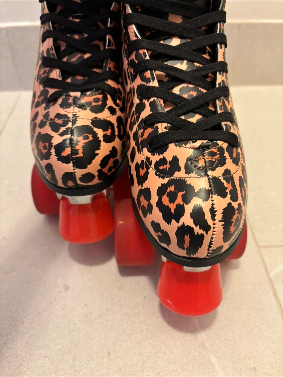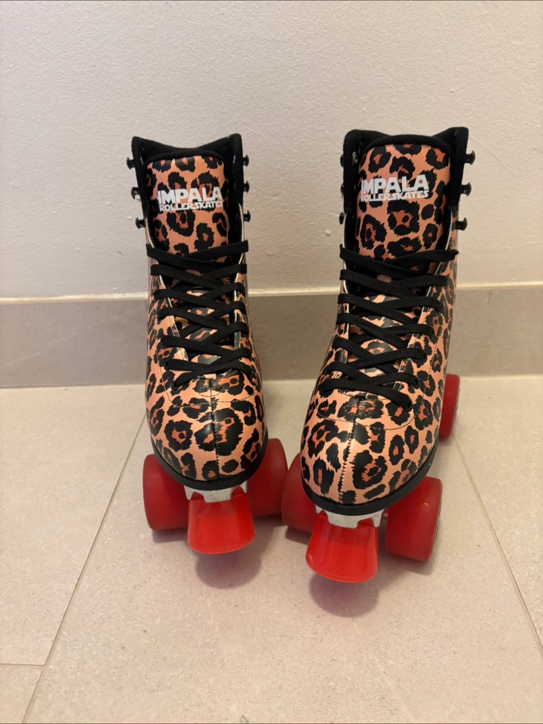 Selling a pair of Impala Rollerskates in a fun leopard print! Comes with the original box. Tried them once and decided they were the wrong size. No scuffs or wear anywhere. They are a size 7 (US Women's) / 38 (EUR). The wheels are a vibrant red. Comes with the original box. These skates are perfect for adding some retro flair to your skating adventures!