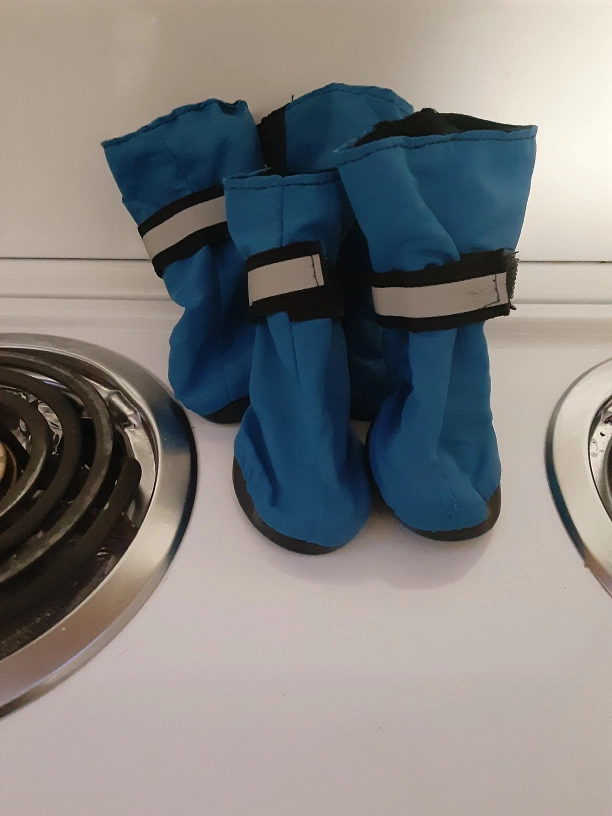 Selling a set of blue dog boots! These are great for protecting your furry friend's paws from the elements. They appear to be in good condition and ready for a new home