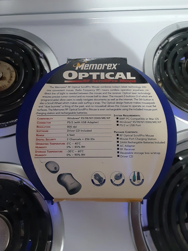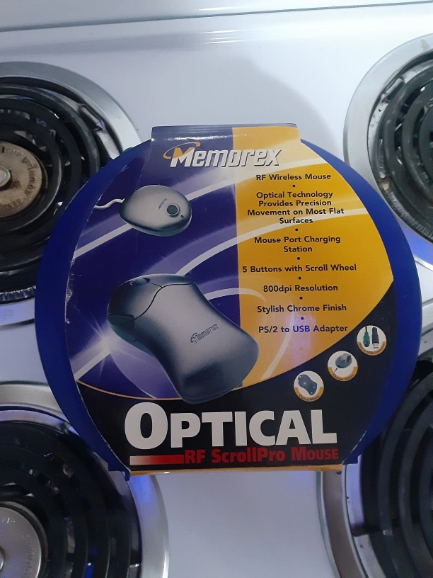Selling a brand new Memorex Optical RF ScrollPro Mouse! This wireless mouse features optical technology for precise movement on most flat surfaces. It has 5 buttons with a scroll wheel and a stylish chrome finish. Includes a PS/2 to USB adapter, a mouse port charging station, 2 AAA rechargeable batteries, an RF receiver, a reusable storage box with strap, and a driver CD