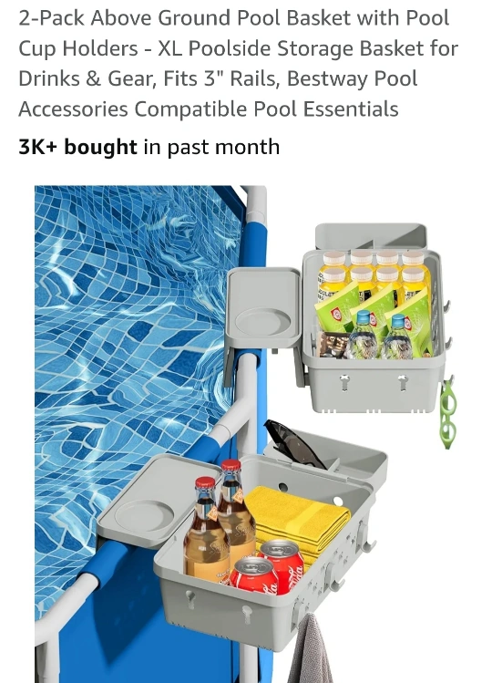 Selling a 2-pack of above-ground pool baskets! These XL poolside storage baskets are perfect for holding drinks and gear. They fit 3" rails and are compatible with Bestway pool accessories and other pool essentials