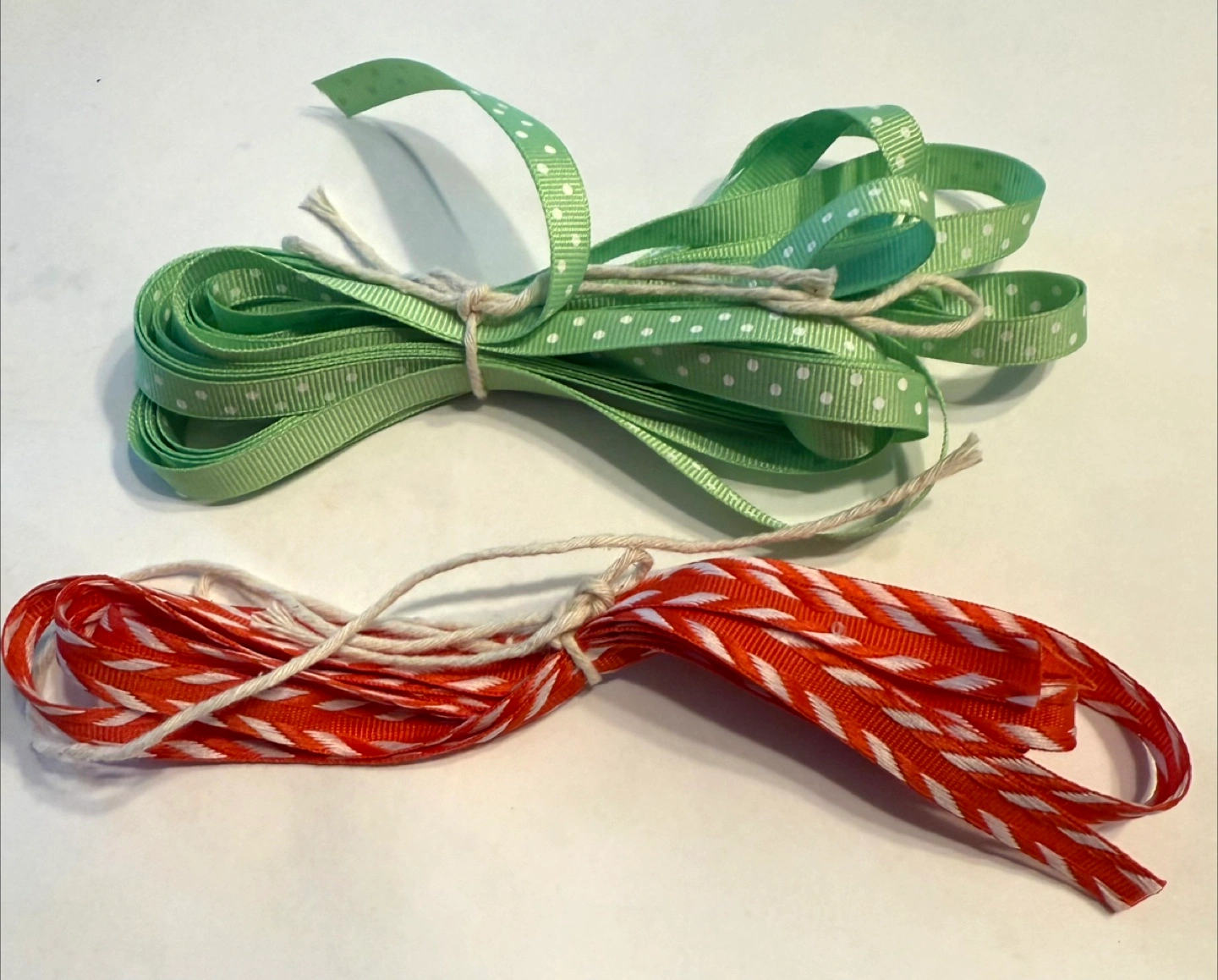 Two bundles of craft ribbon are up for grabs! One is a light green with white polka dots, and the other is orange with a white striped pattern. Perfect for gift wrapping, scrapbooking, or any DIY project you have in mind. **Note: if you are interested, ask and I will measure the ribbon lengths.