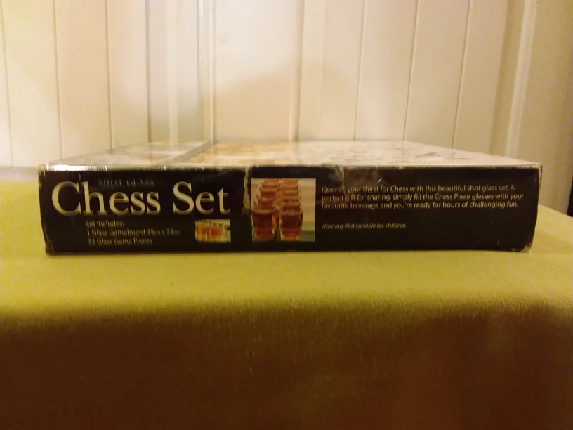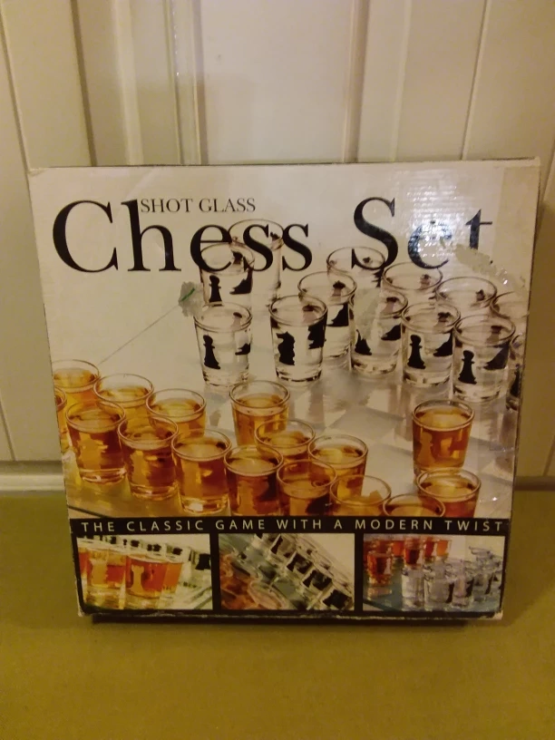 The set includes a glass game board and 32 shot glass game pieces, perfect for a fun and unique twist on the classic game π