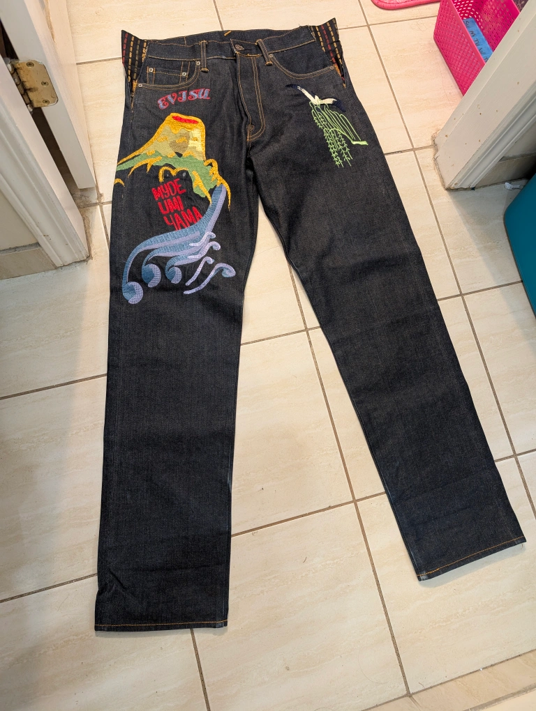 Selling a pair of EVISU Heritage denim jeans. They feature unique embroidery designs on the front and back pockets. Great for adding a statement piece to your wardrobe!