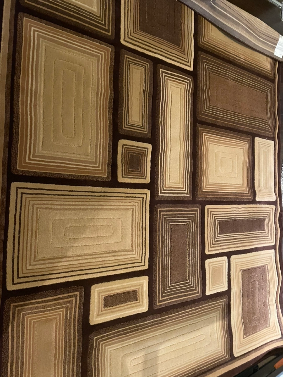 This Legacy Pavilion area rug is in brown tones and measures 6'7" x 8'6" (200x260 cm). It's made with polypropylene solution dyed yarn, making it stain-resistant and easy to clean. The rug is designed for use with a non-slip pad for added safety and comfort. The cleaning instructions recommend spot cleaning or professional cleaning. Like new no stains