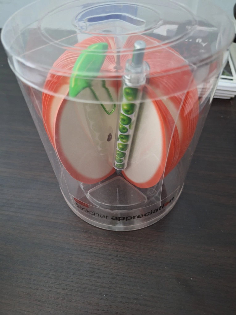Here's a cute set of apple-shaped notes with a matching pen for teacher appreciation! It comes in a clear container to keep everything organized and makes a thoughtful gift for educators