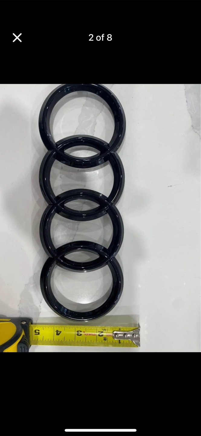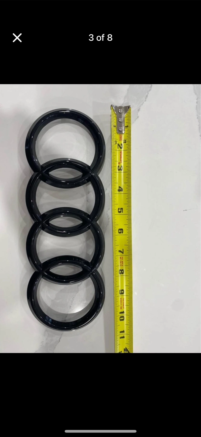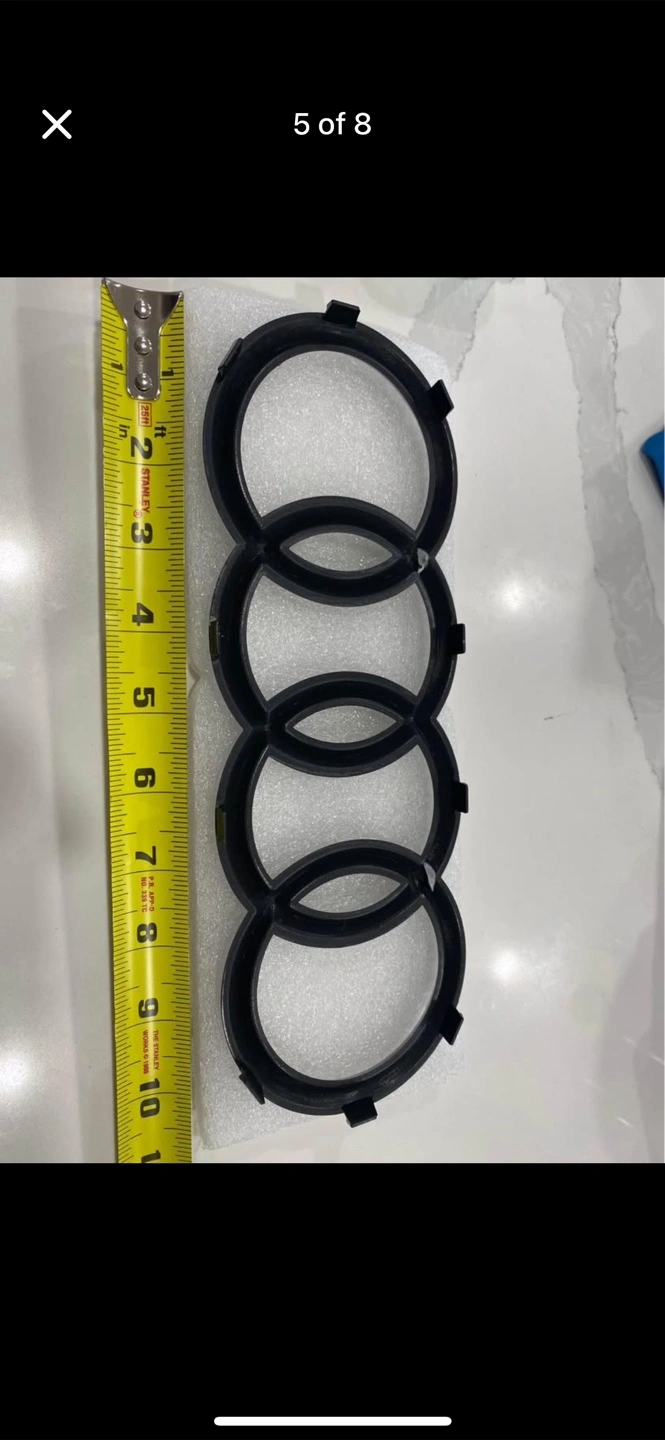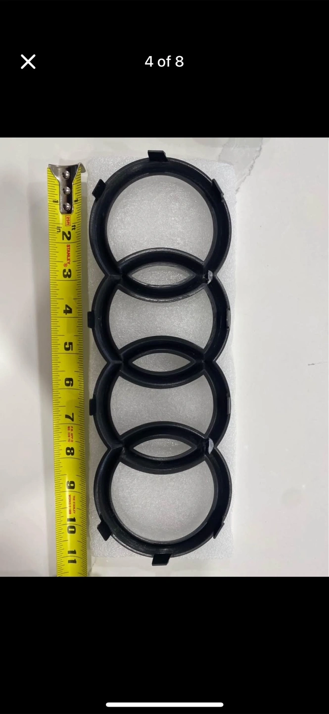 Selling a black Audi emblem badge. Appears to be in good condition. Measures approximately 9 inches in length.