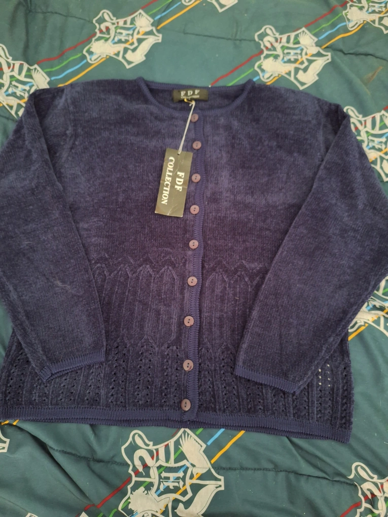 Here's a lovely blue cardigan from FDF Collection! It features a classic button-down design and a delicate knit pattern. Perfect for layering on those cooler days!