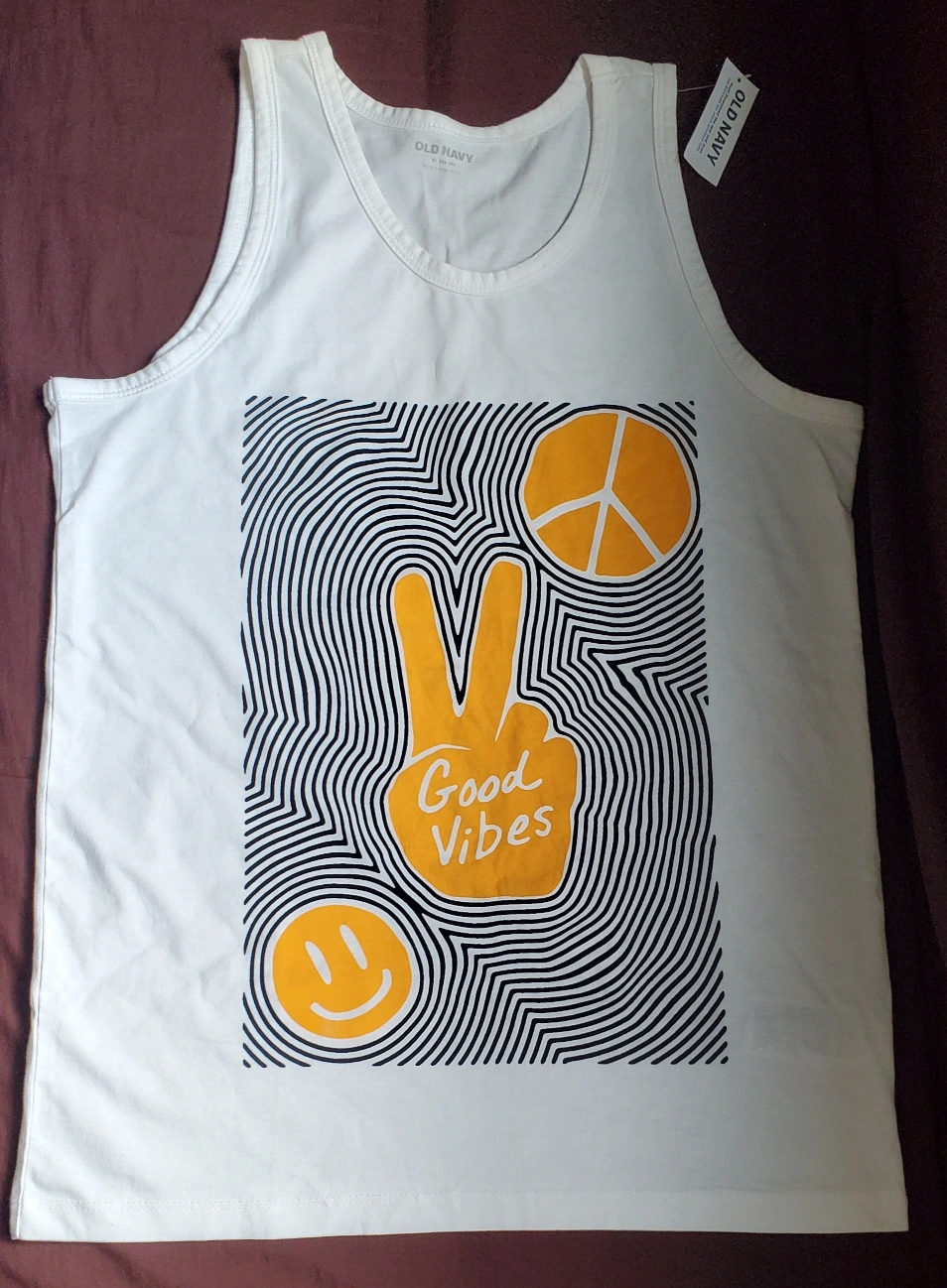 Here's a white tank top from Old Navy! It has a fun 'Good Vibes' graphic on the front. Perfect for summer! Ages 14/16