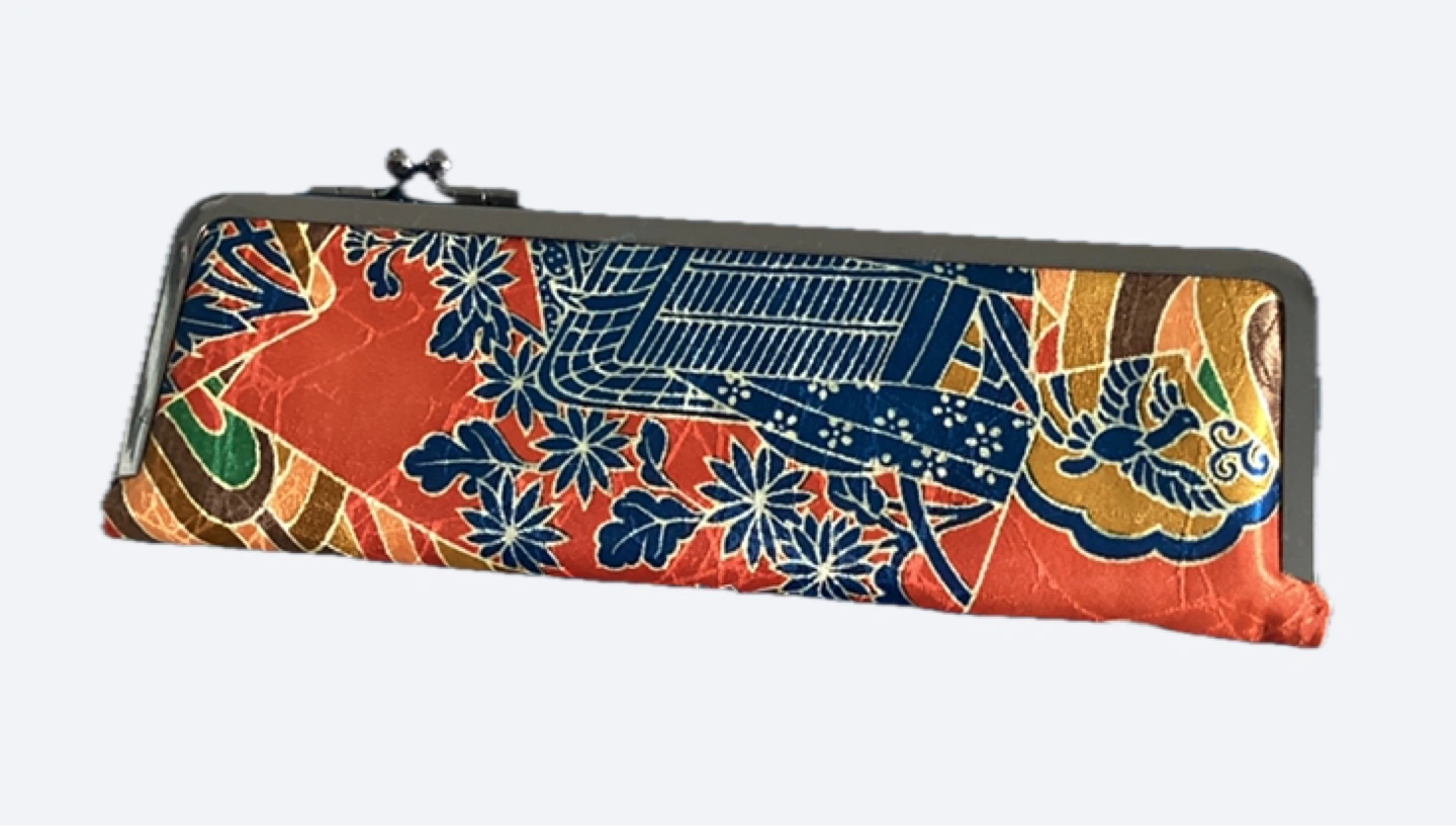 This is a vintage Japanese fabric case with a comb and mirror inside. The case has a unique design with orange, blue, and gold colours. It would be a great addition to any collection!