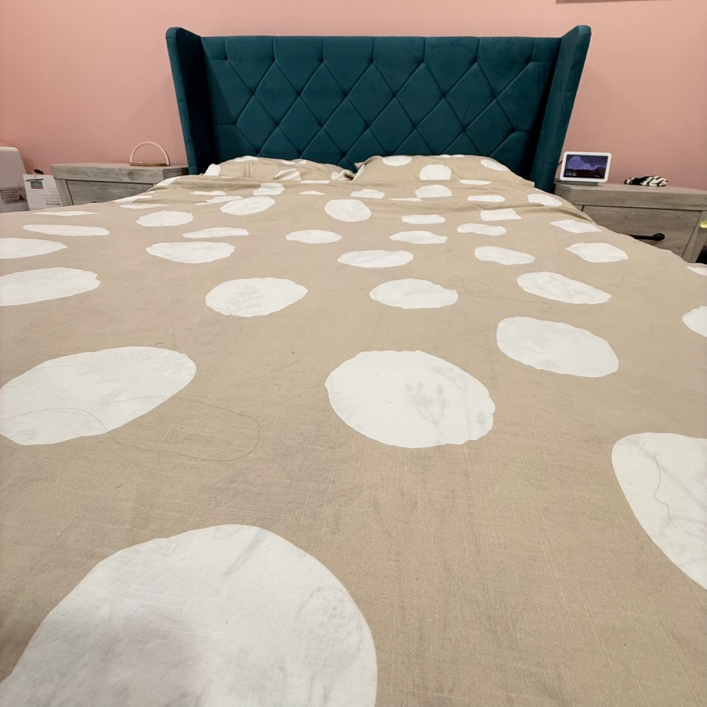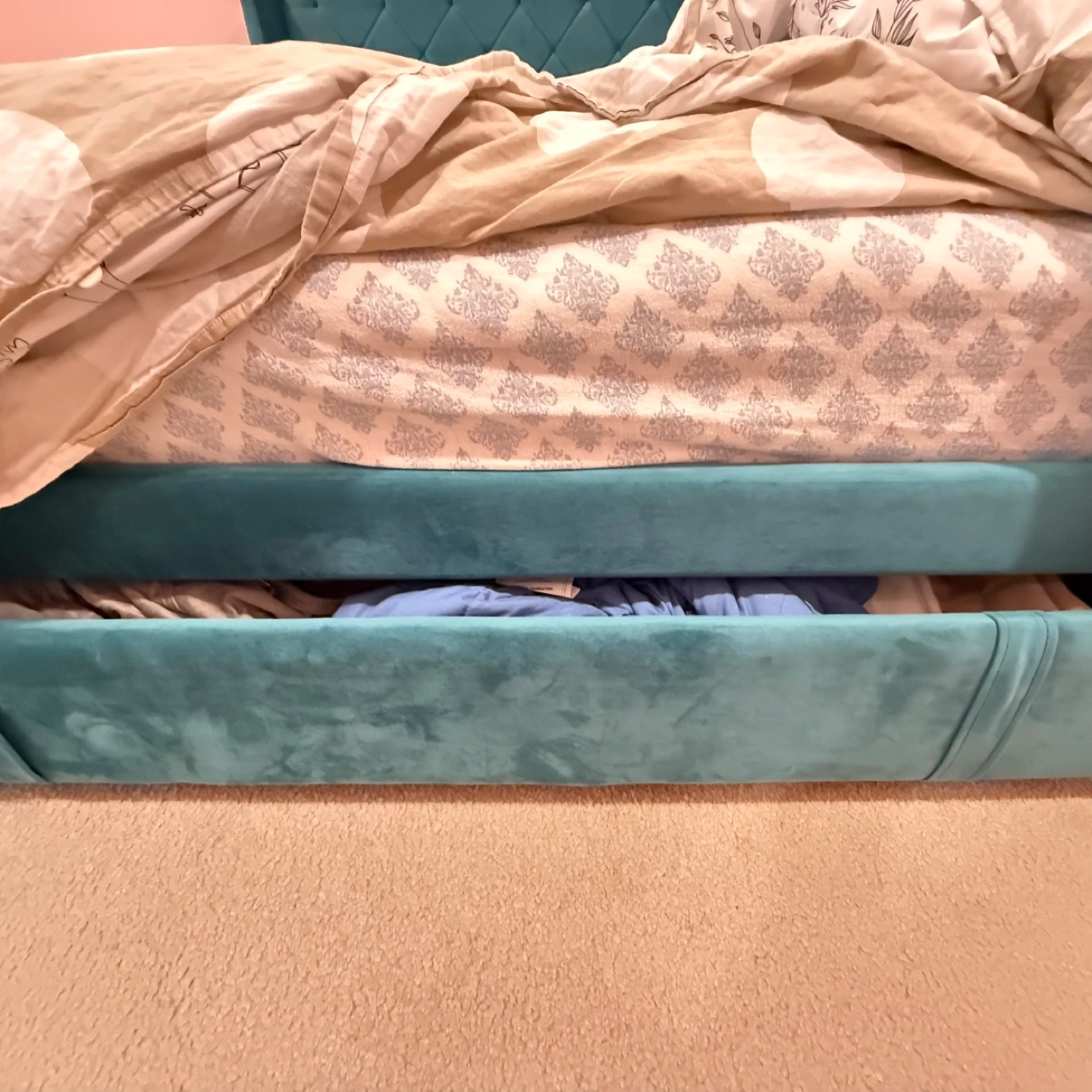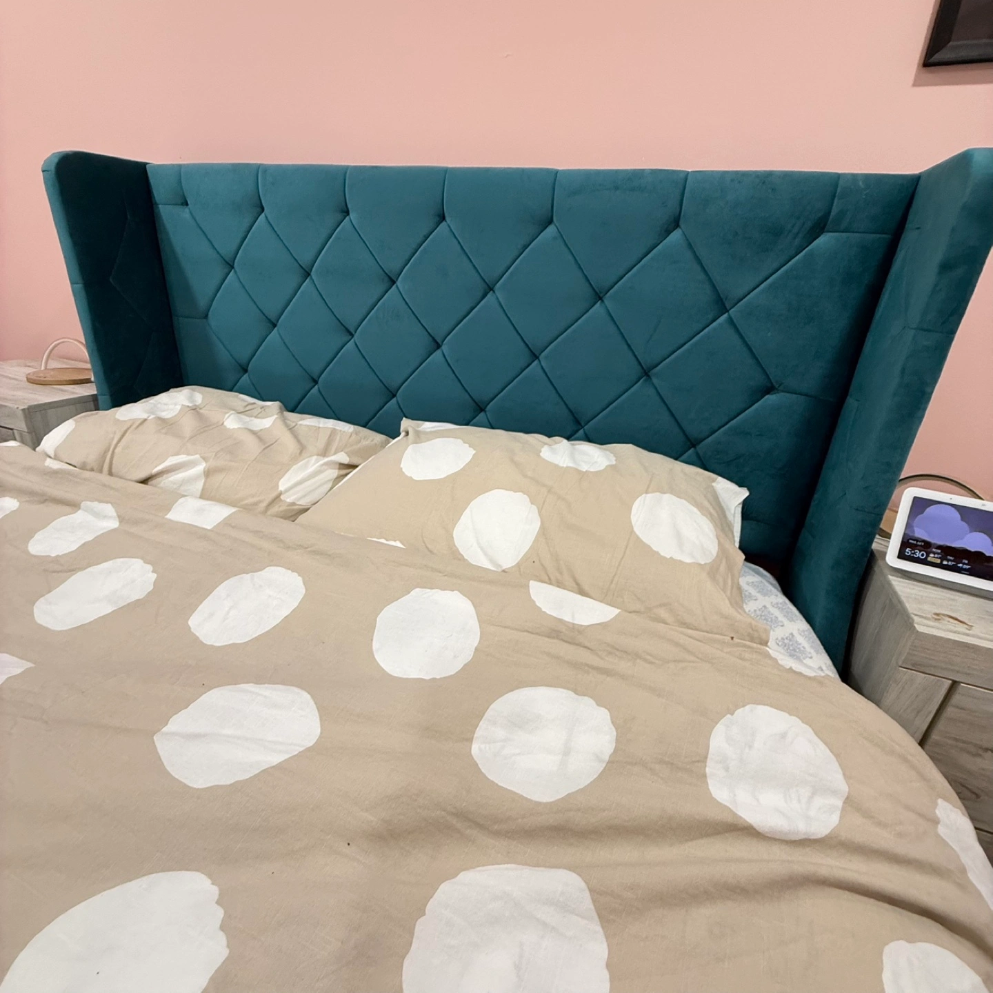Selling a teal upholstered bed frame. It's in great condition and would add a pop of color to any bedroom! The frame features a tall, tufted headboard and a sturdy base. Perfect for a comfortable and stylish sleep experience