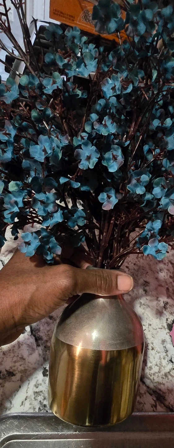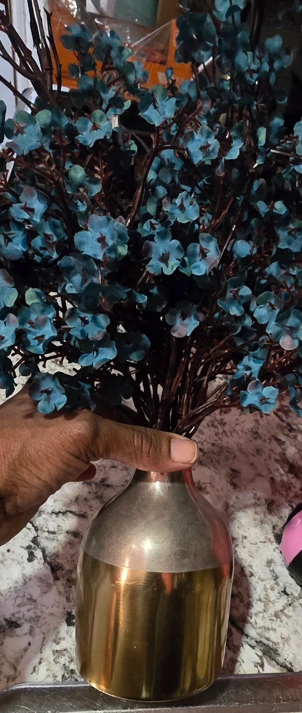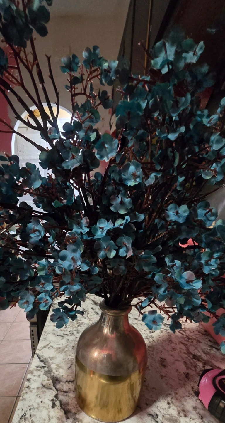 This set includes artificial eucalyptus stems in a striking teal blue color. They come in a stylish small vase with a metallic gold and silver finish. It's a lovely addition to any home decor!