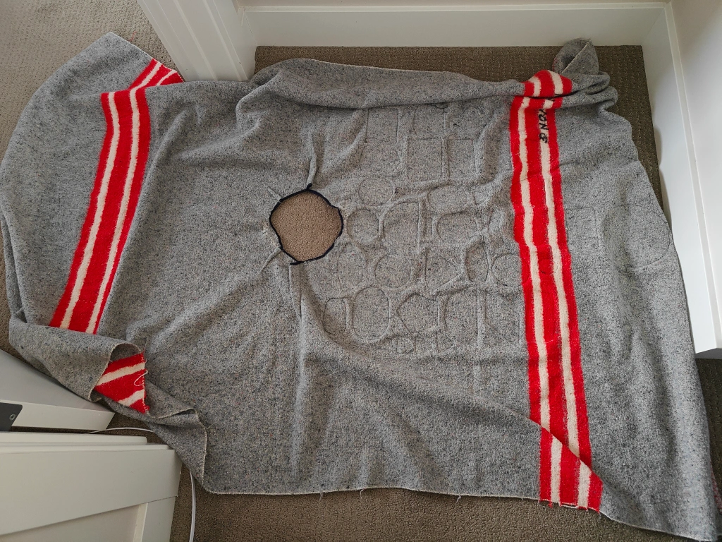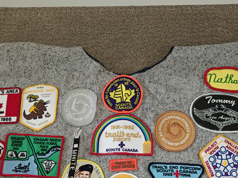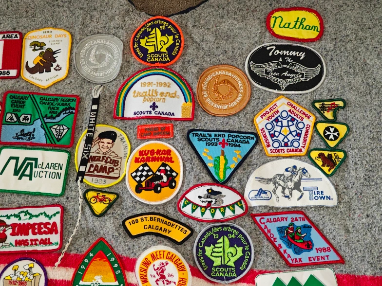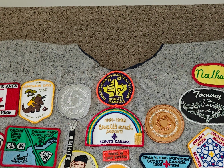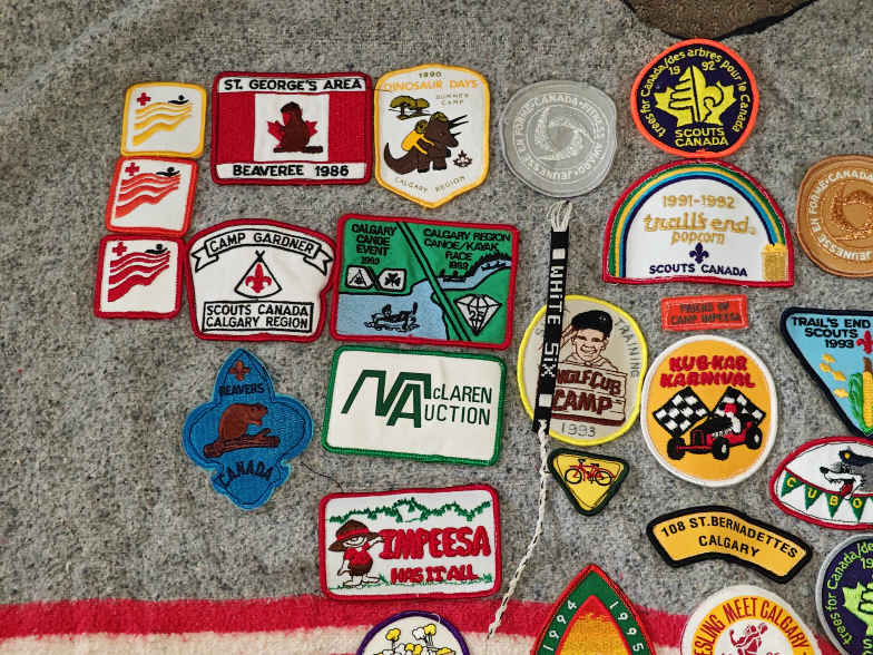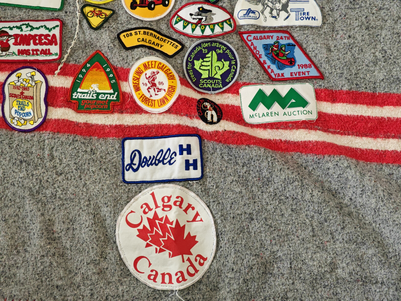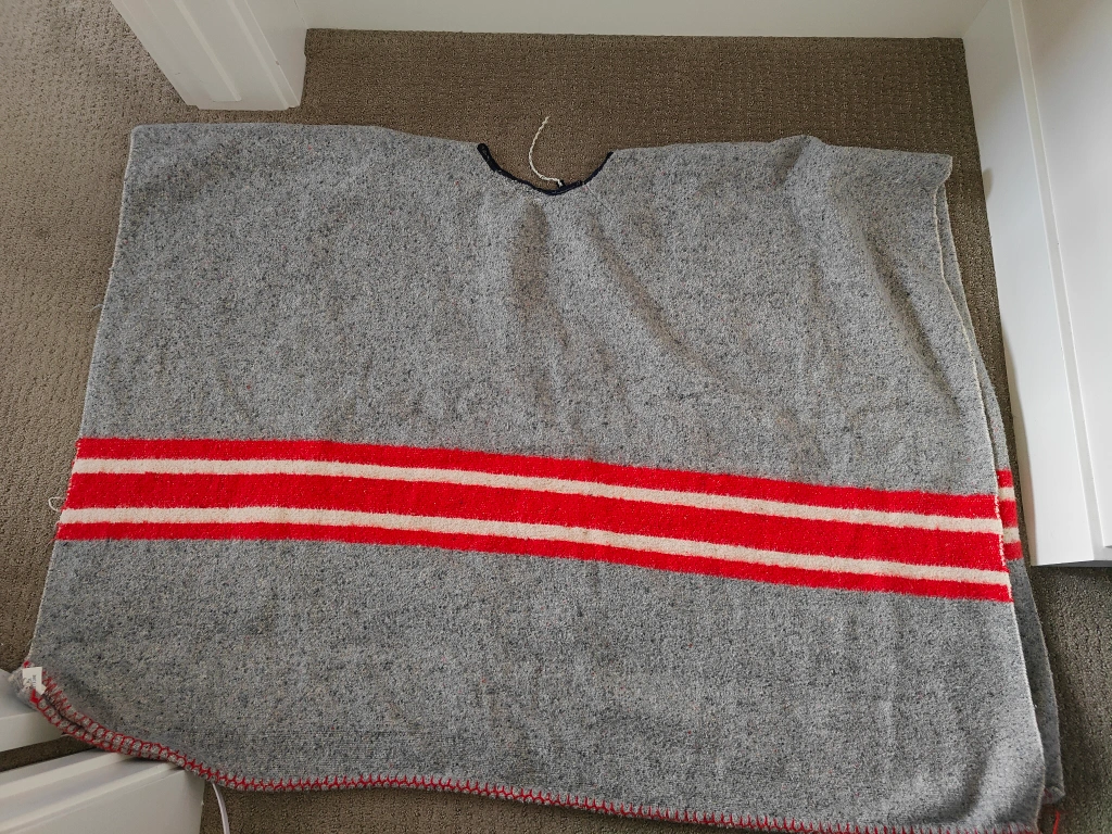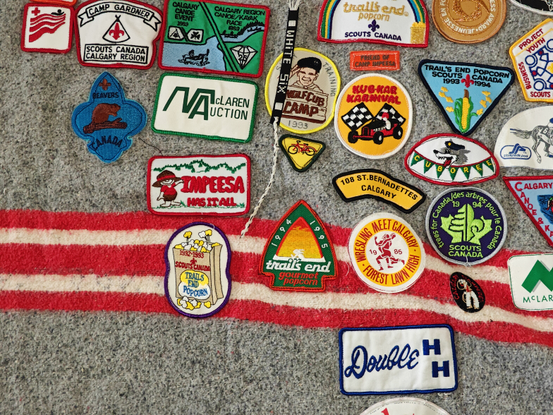 I am selling a Vintage Personalized Boy Scouts Camp Fire Blanket Poncho with Badge Patches from the 1980s to 1990s in used, good condition. Used an old vintage camping campfire blanket and cut a hole in the middle to allow the head to fit through and sewed on various badges / patches onto the blanket. Badges from Beavers Canada, Wolf Cubs, Scouts Canada, and other organizations.