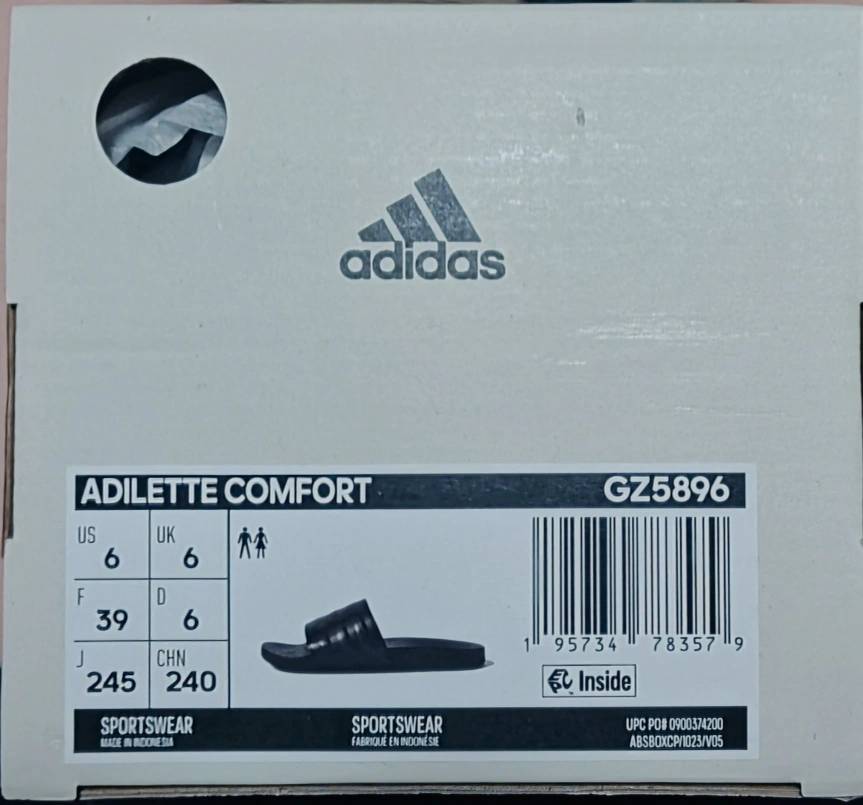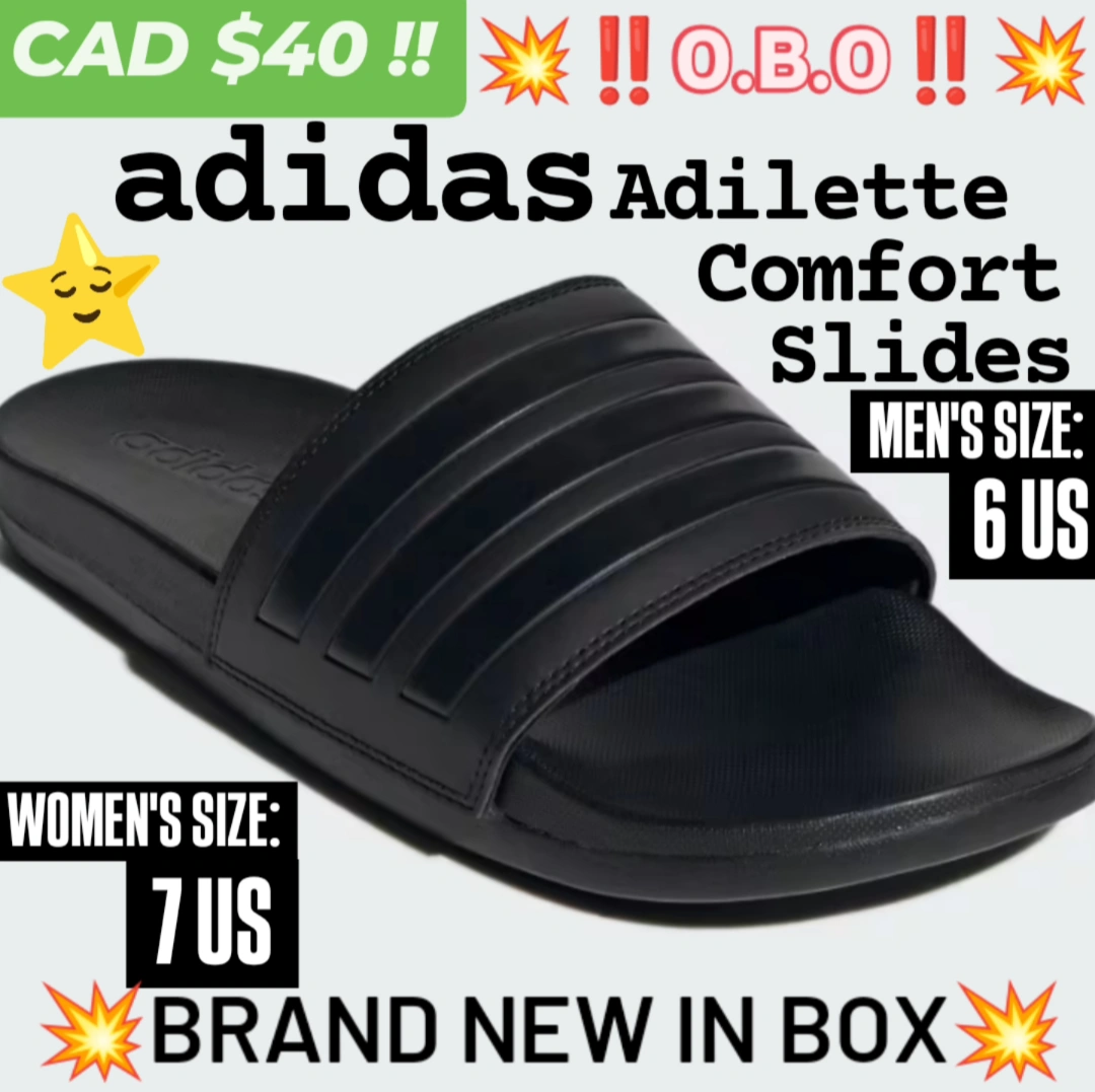 BRAND NEW in original box with tags, adidas Adilette Comfort slides are in a men's size 6, corresponding women's size 7 US and have a black colorway. Perfect for lounging around or wearing to the pool! ASKING $40 CAD O.B.O.