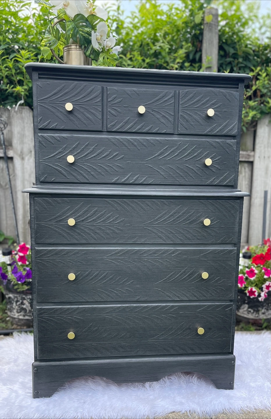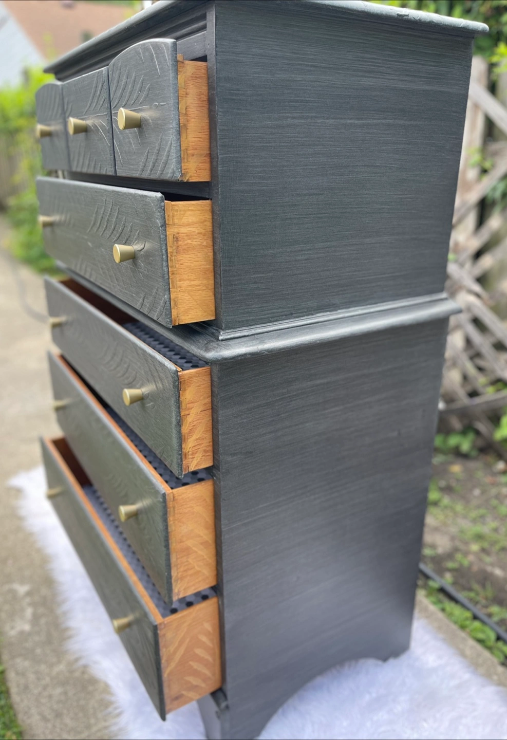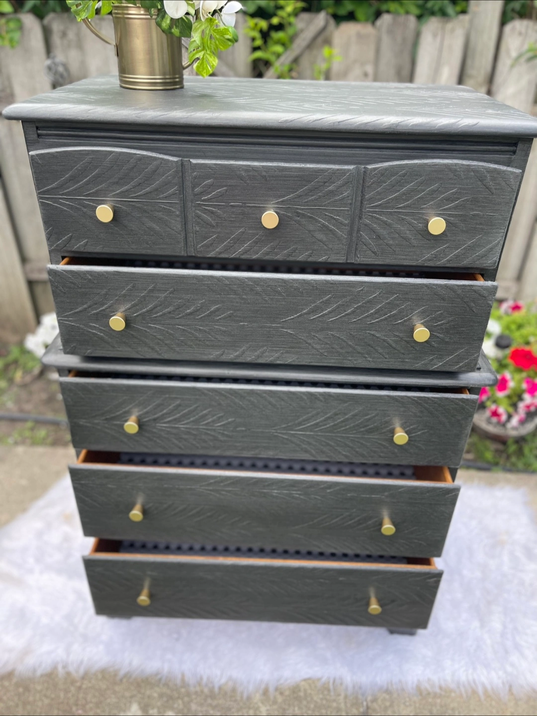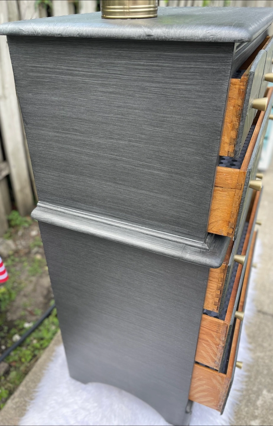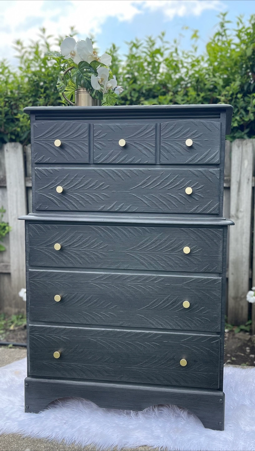 Beautiful 5 drawers dresser redone in modern gray brushed finish. Very versatile piece.
