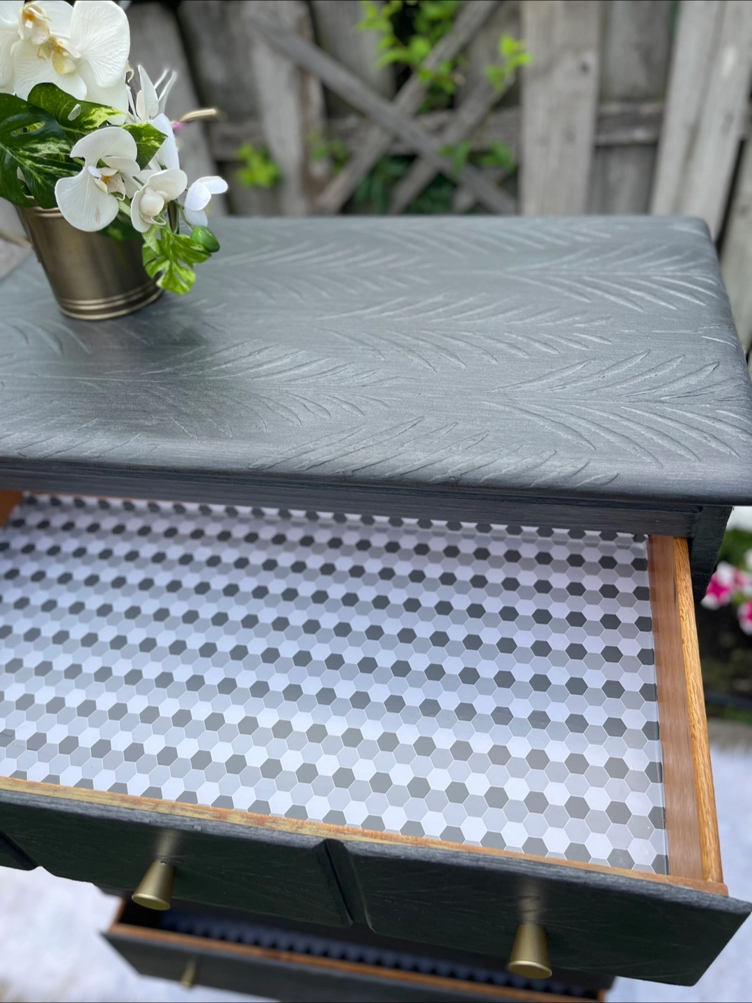 Featuring 2 layers of primer, 2 layers of paint, and 3 layers of polycrylic for extra protection and durability. Raised stencil added.