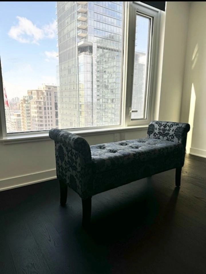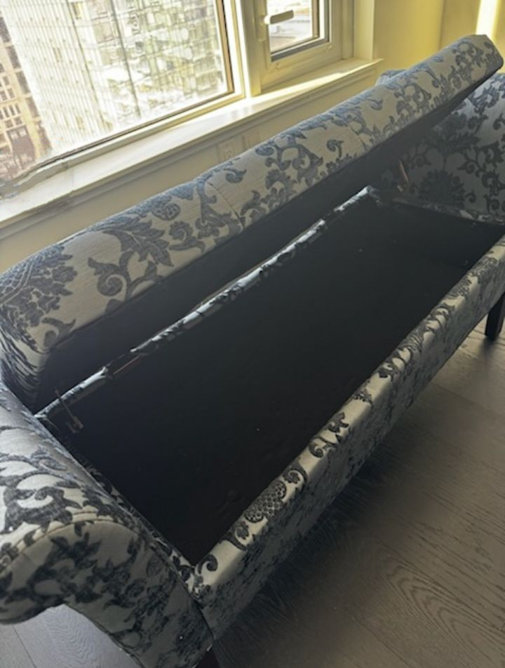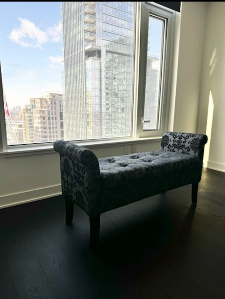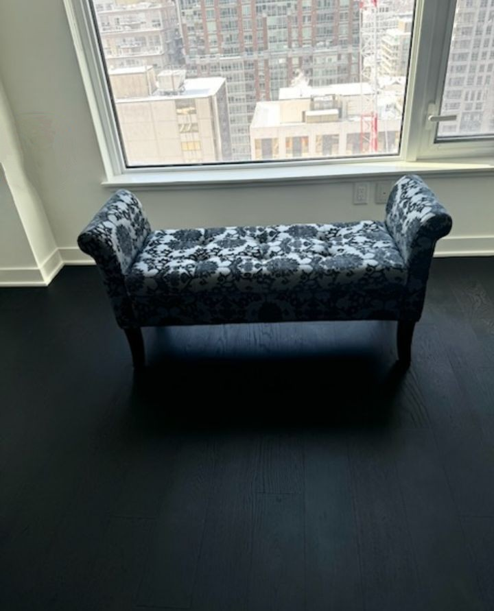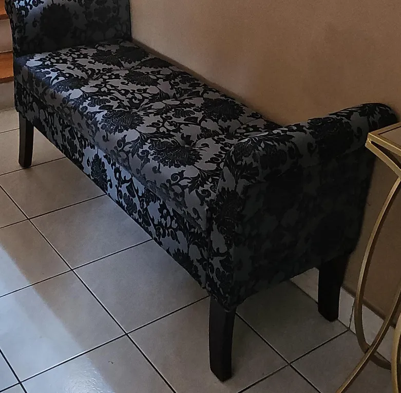 Selling a stylish upholstered storage bench! It's in perfect condition and features a beautiful floral pattern. The bench also has a storage compartment.