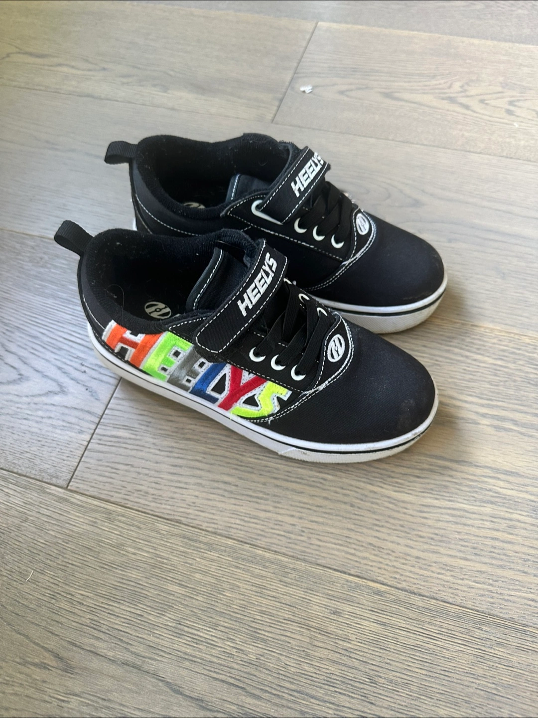 Heelys roller shoes in size 2! These are in good condition and ready for some fun rolling adventures. They are black with the Heelys logo on the side and have a velcro strap for easy fastening