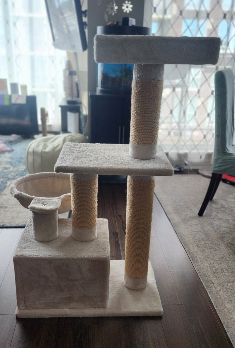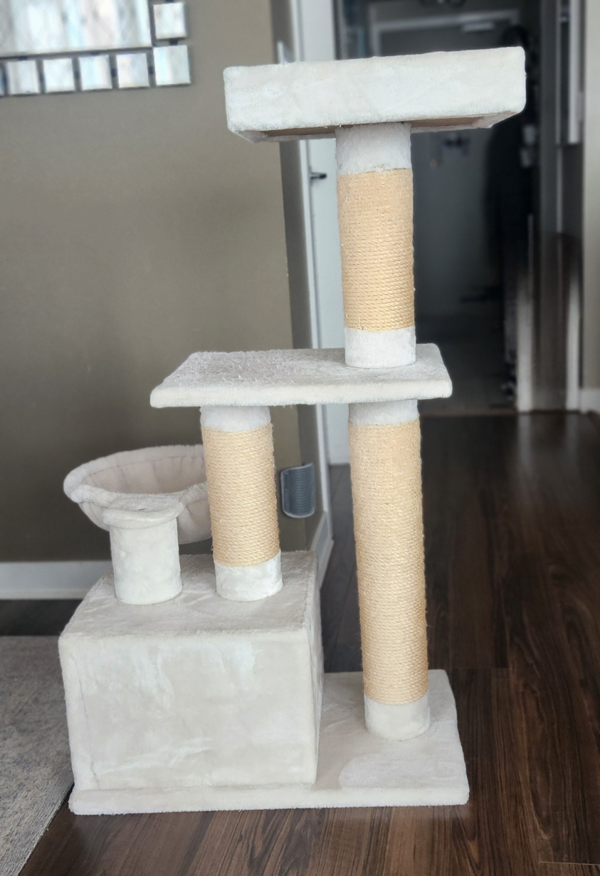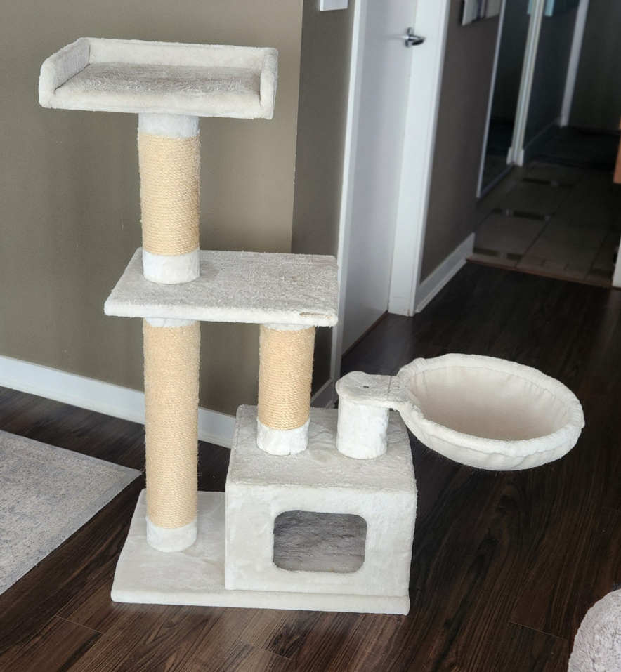 Extra-large cat tree featuring multiple levels, scratching posts, and a cozy hammock and covered bed for your furry friend to relax in. It's in good condition with only a couple of areas of minor wear. Hammock and top tier can be adjusted to either side to fit into a new home perfectly! Base without the hammock measures 25.5" long, 16" high and 45" high. The hammock measures an additional 16" and can be left in the middle or turned to either side.