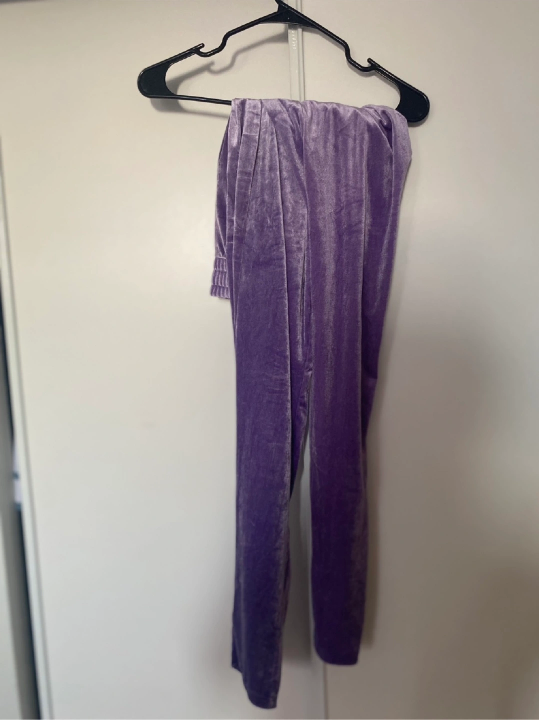 I'm selling a bundle of assorted women's clothing. The bundle includes a pair of purple velvet pants, a black graphic tee, a black tank top, a black button-up shirt, and a grey sweater. All items are in great condition!